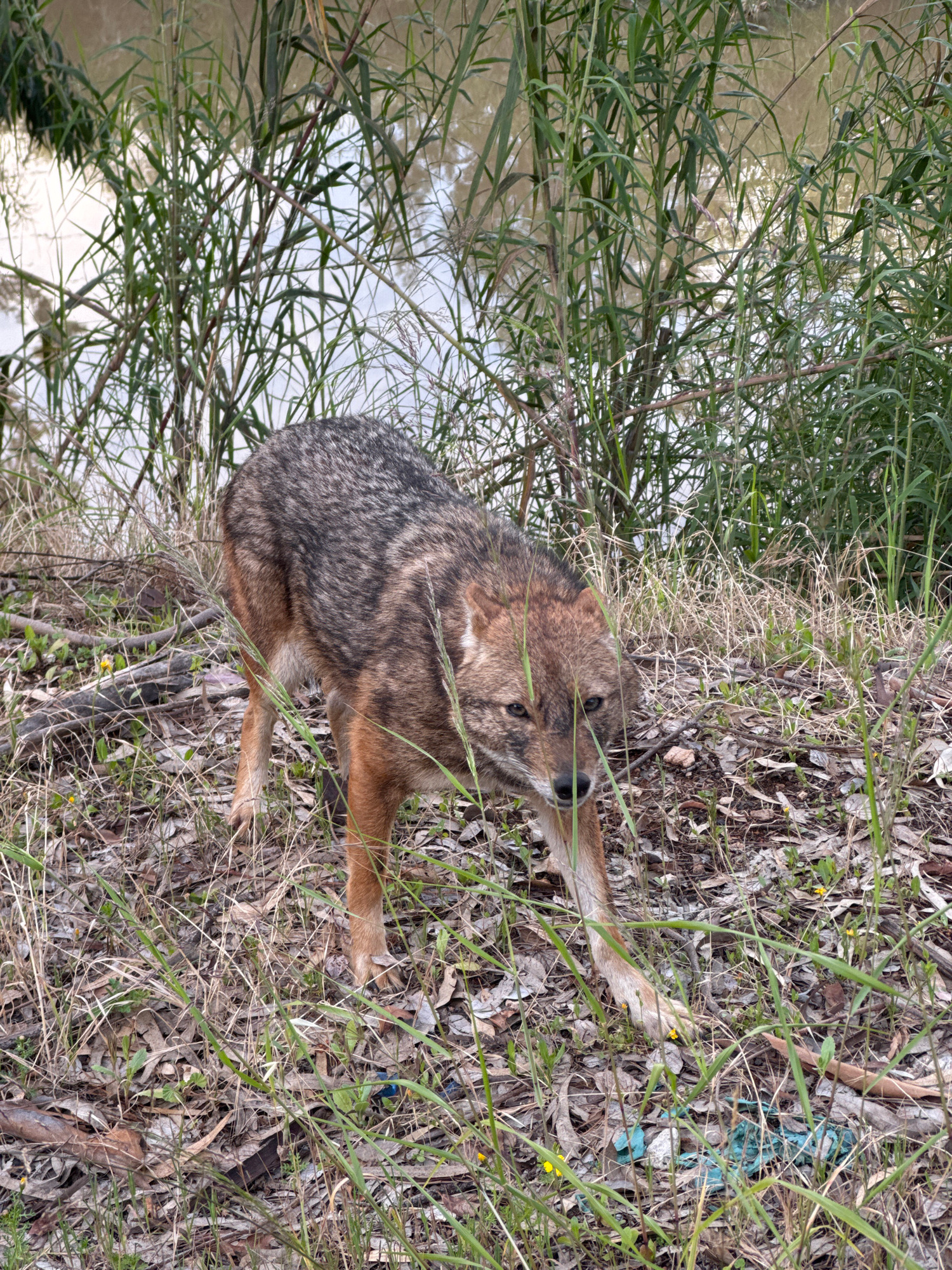 An adult golden jackal (Canis aureus) stands on a sloped, vegetated bank, facing towards the viewer. Its fur is mottled gray-brown on the back, transitioning to a lighter reddish-brown on its flanks,…read more