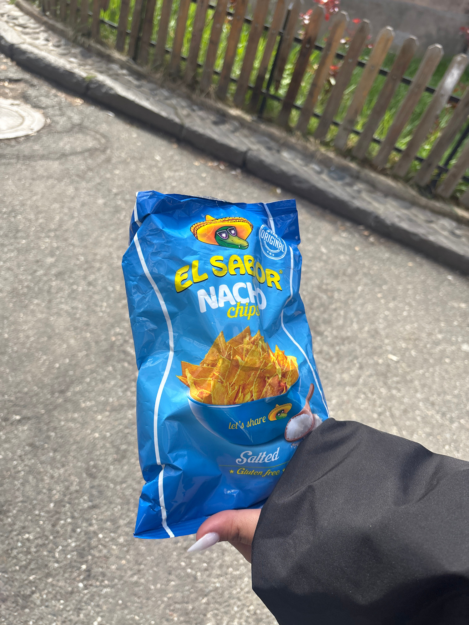 A person in a black jacket holds a bag of "El Sabor Nacho Chips" in their right hand. The bag is blue with a picture of tortilla chips on it. The words "El Sabor Nacho Chips" are prominently displayed…read more