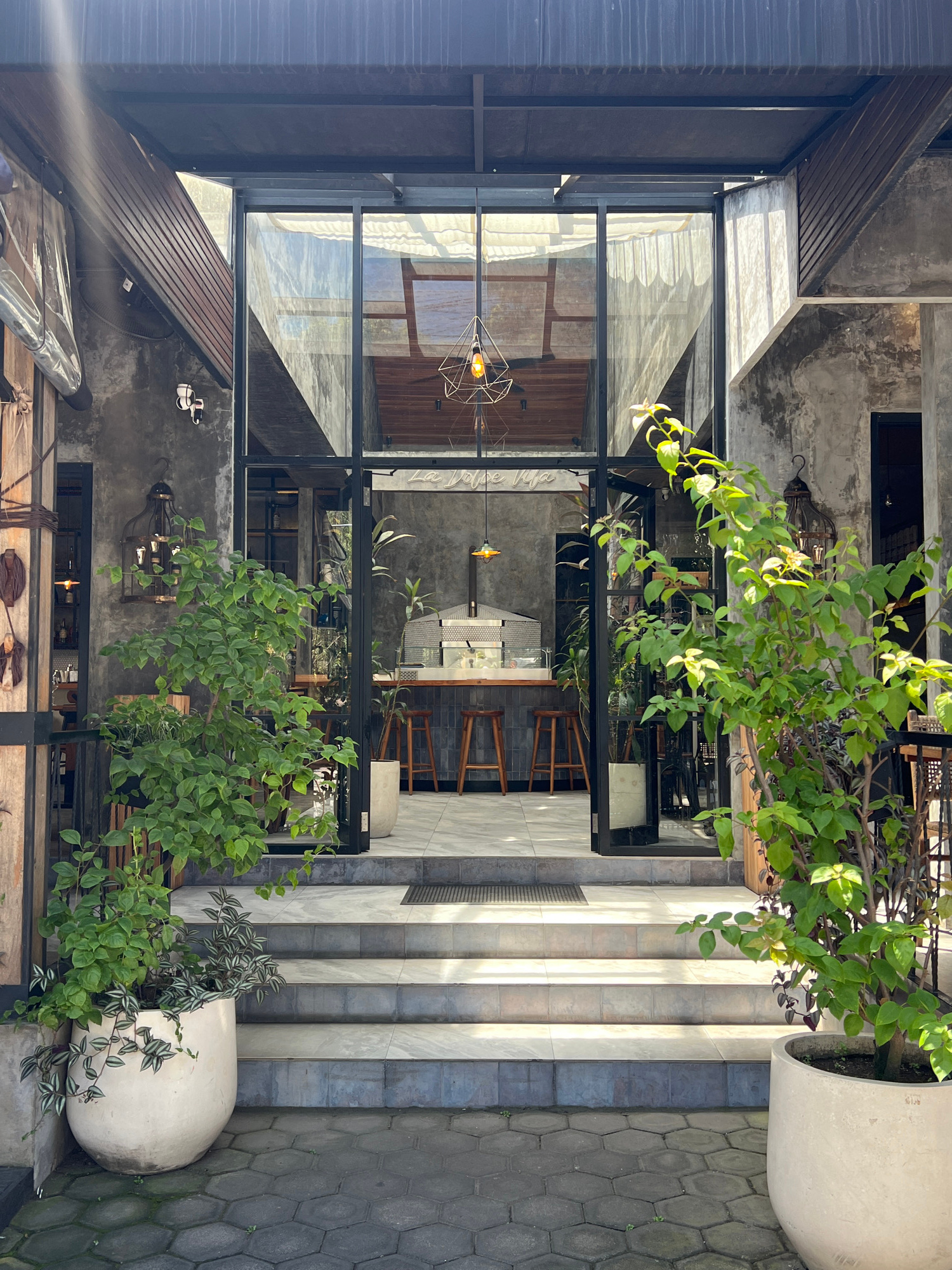 The image shows an outdoor entrance in Ubud, Indonesia. The entrance is framed by a structure with glass panels and dark metal supports. Inside the glass enclosure is a cafe with a counter, tables, an…read more