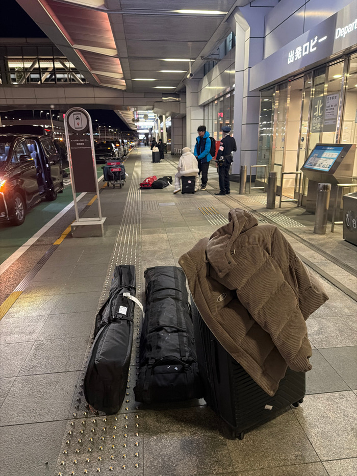 The image captures a luggage-laden scene at an airport or transportation hub. A large suitcase with a brown corduroy jacket rests on top, followed by two black duffel bags, possibly for skis or snowbo…read more