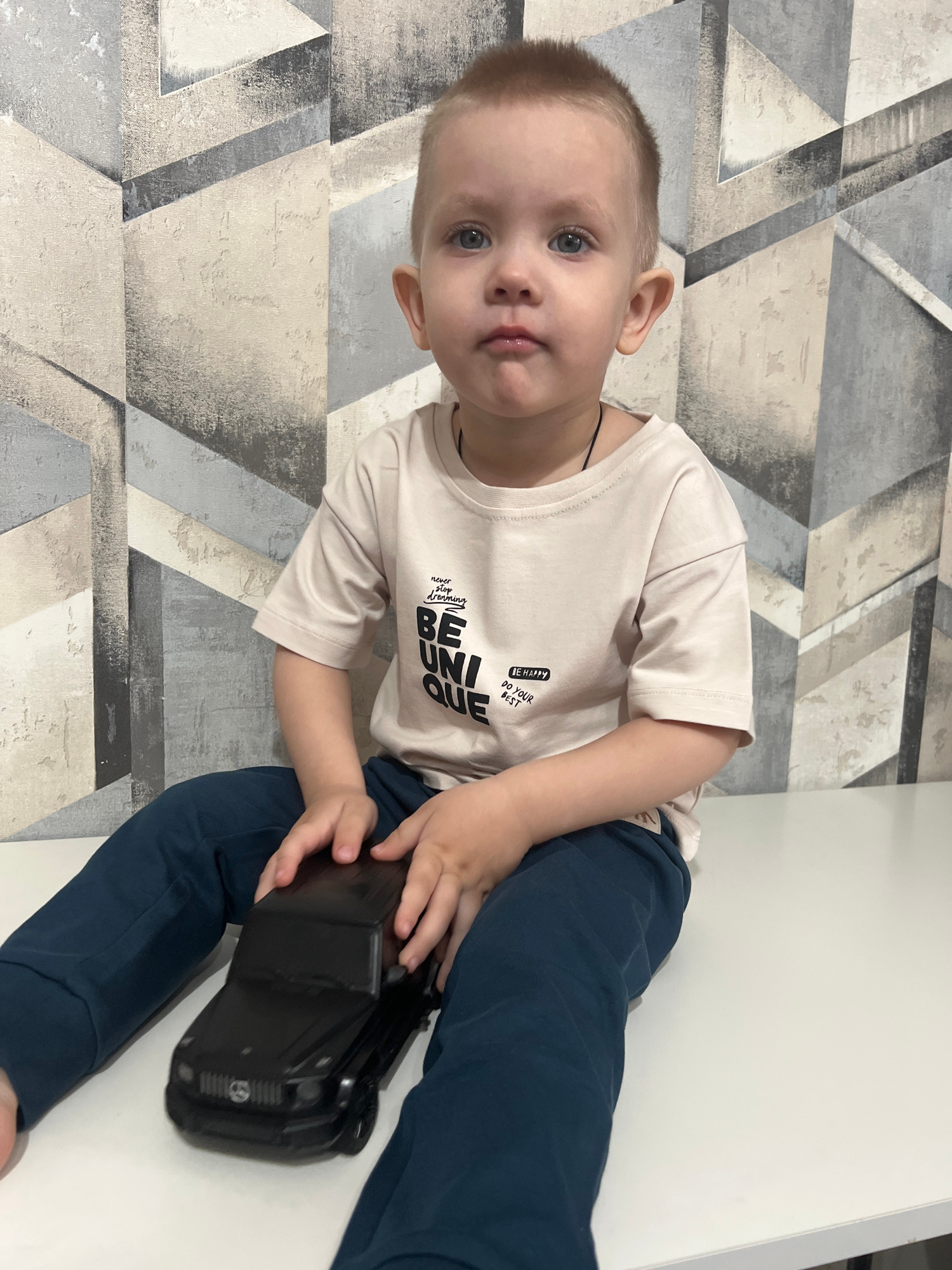 A young boy with short blond hair and blue eyes is sitting on a white surface, holding a black camera. He is wearing a light beige t-shirt with "BE UNIQUE" printed on it and dark blue pants. The backg…read more