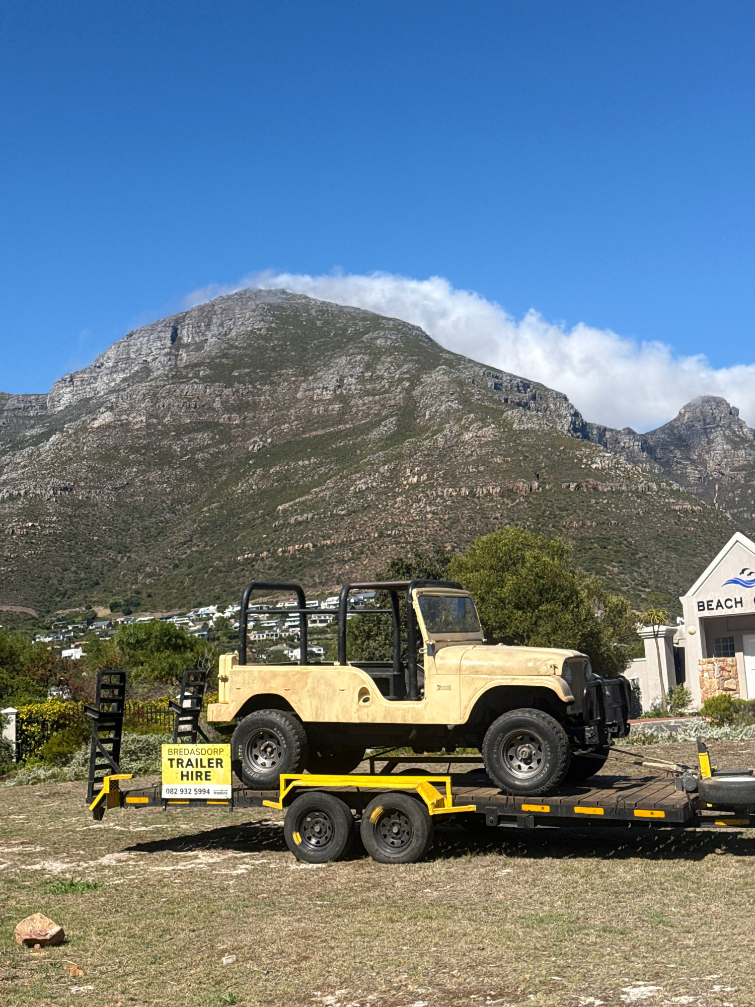 A beige Jeep-like vehicle without doors is secured on a yellow trailer, parked on a grassy area. A sign on the trailer advertises Bredasdorp Trailer Hire. In the background, a large mountain rises, pa…read more