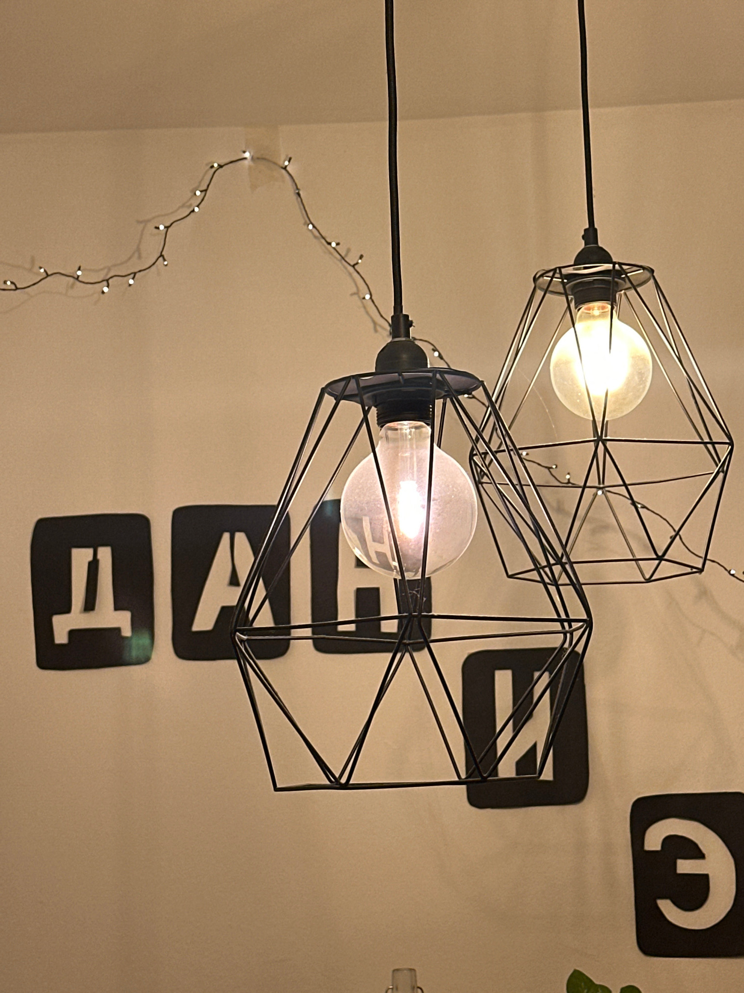 Two hanging light fixtures with geometric wireframe shades are illuminated against a light beige wall. The upper light fixture is slightly out of focus, while the lower one is sharper. To the right of…read more