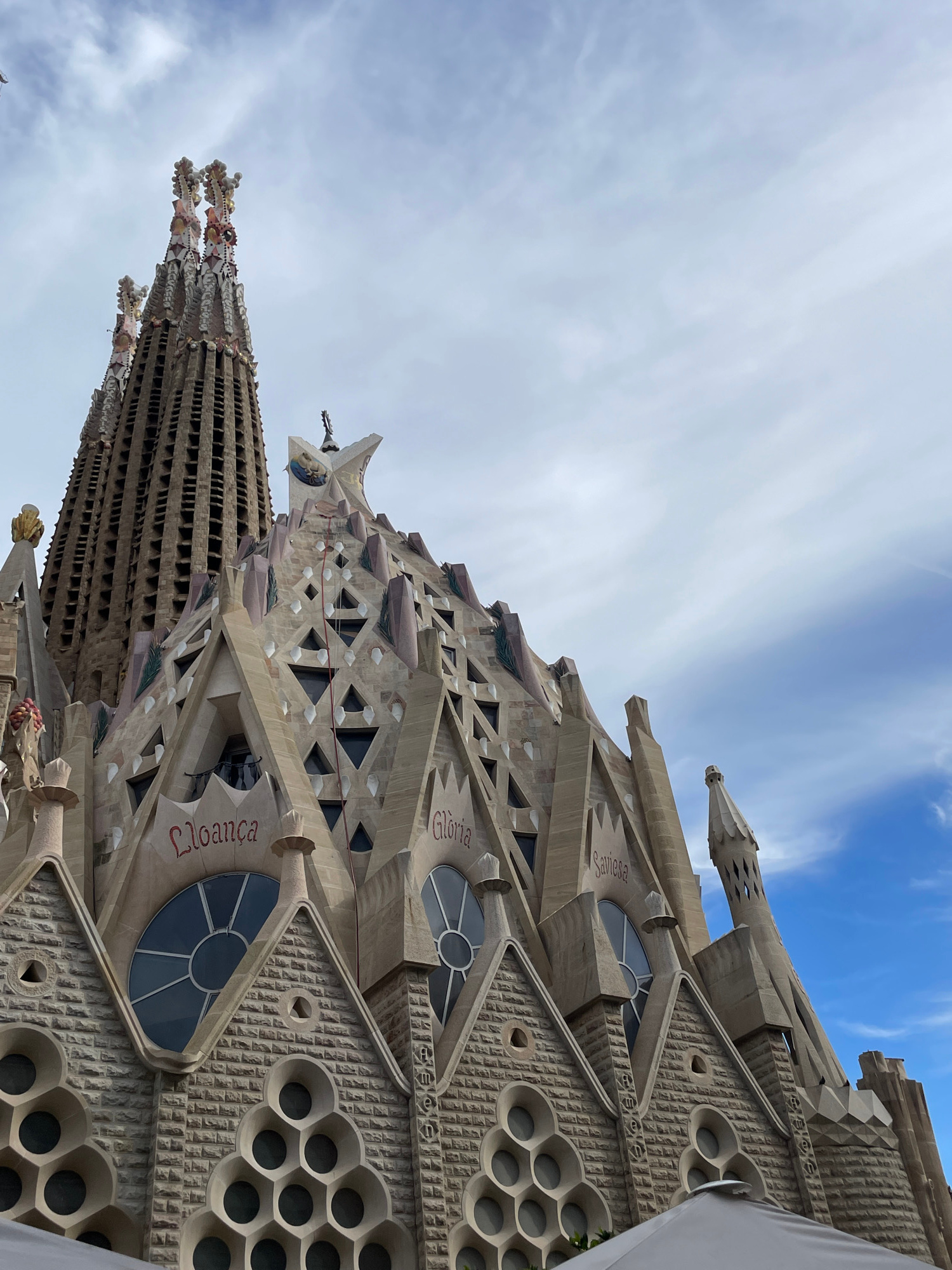 The image captures an upward view of the Sagrada Familia basilica in Barcelona, Spain. The structure's architectural details are prominent, including the honeycomb-like textures, triangular windows, a…read more