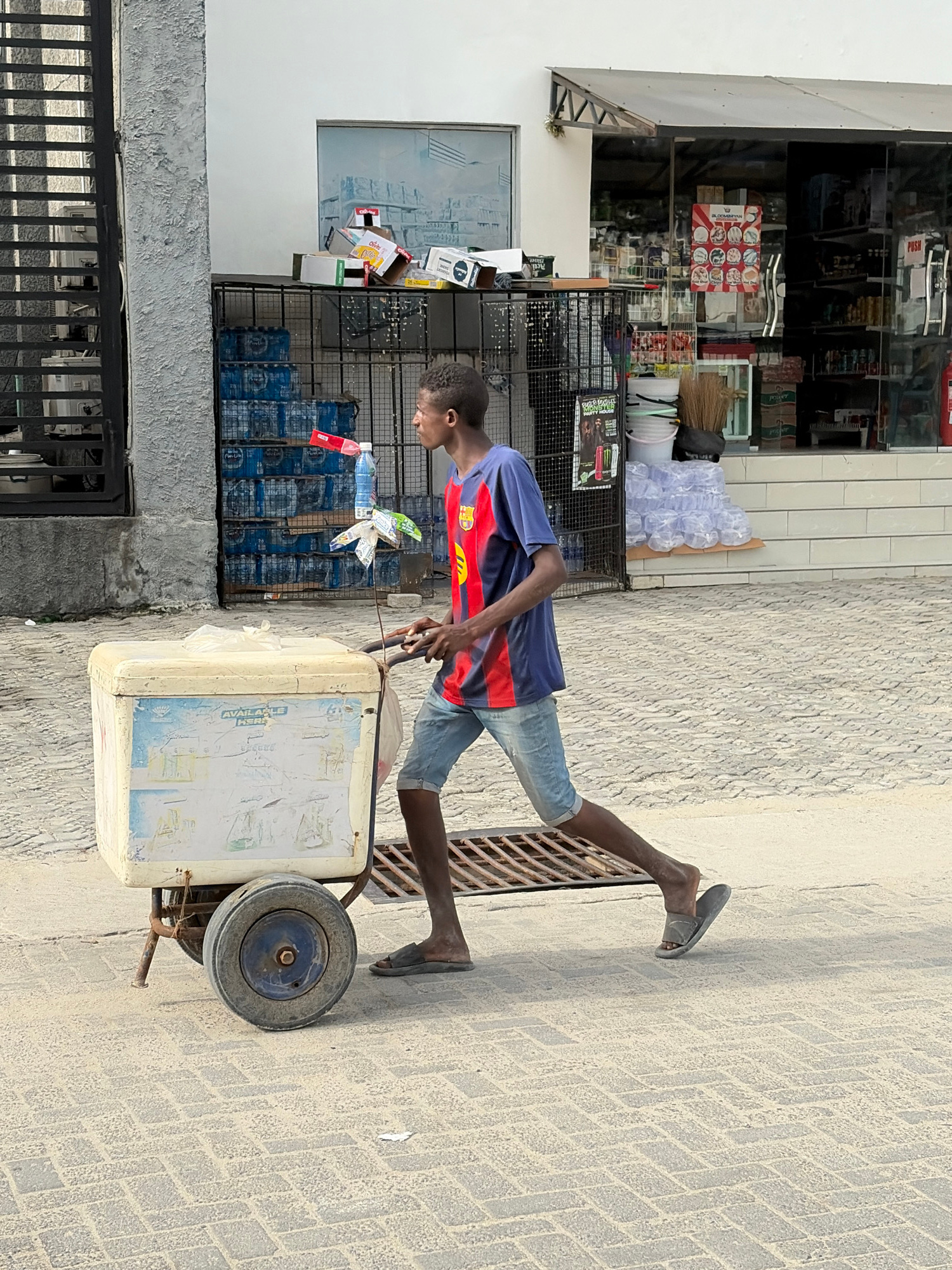 A young man is pulling a wheeled cart on a paved street in Igboefon, Nigeria. The cart is white and appears to be filled with goods, with a wheel visible on the right side. The man is wearing a blue a…read more