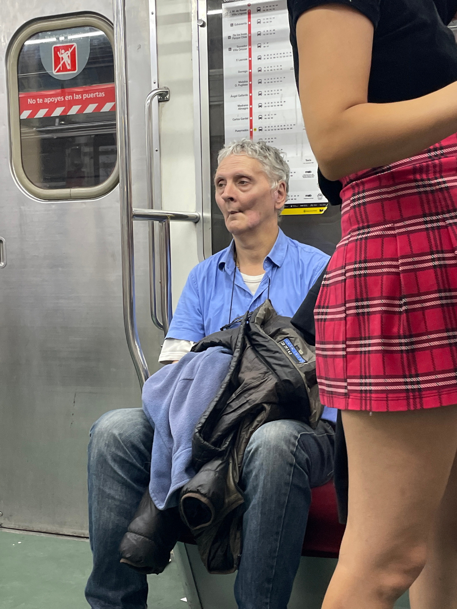 A photograph shows a man sitting on a subway train in Buenos Aires, Argentina. The subway car has a sign that says "No te apoyes en las puertas." A subway line map is visible above the man's head. The…read more