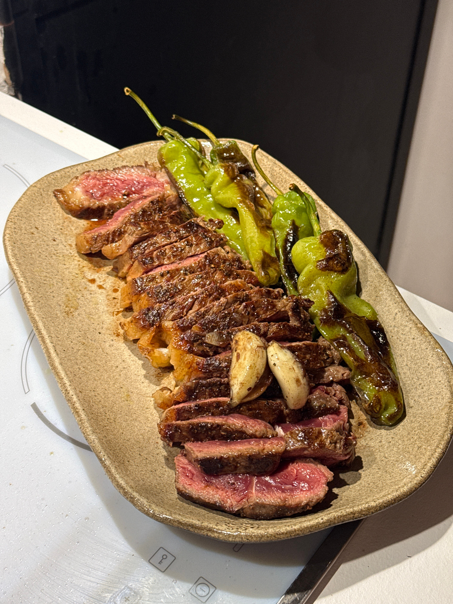 A forensic examination of the image reveals a close-up, elevated view of a prepared meal served on an elongated, oval, tan-colored ceramic plate, situated in a kitchen setting in Milan, Italy. The pri…read more
