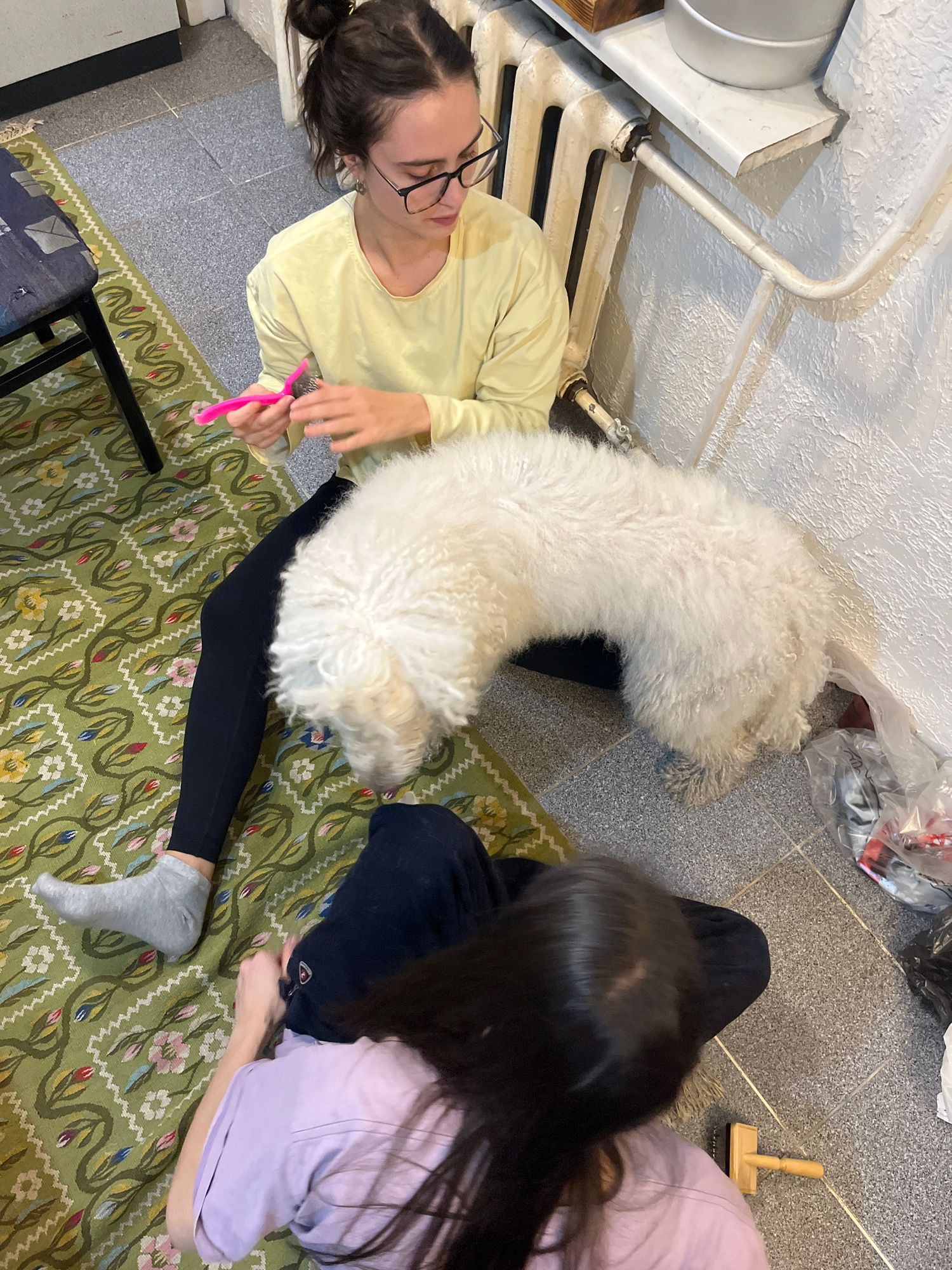 The image presents an overhead perspective of an indoor setting. Two individuals, presumably female, are seated on a green, patterned rug, adjacent to a white, furry dog. One person, wearing a light y…read more