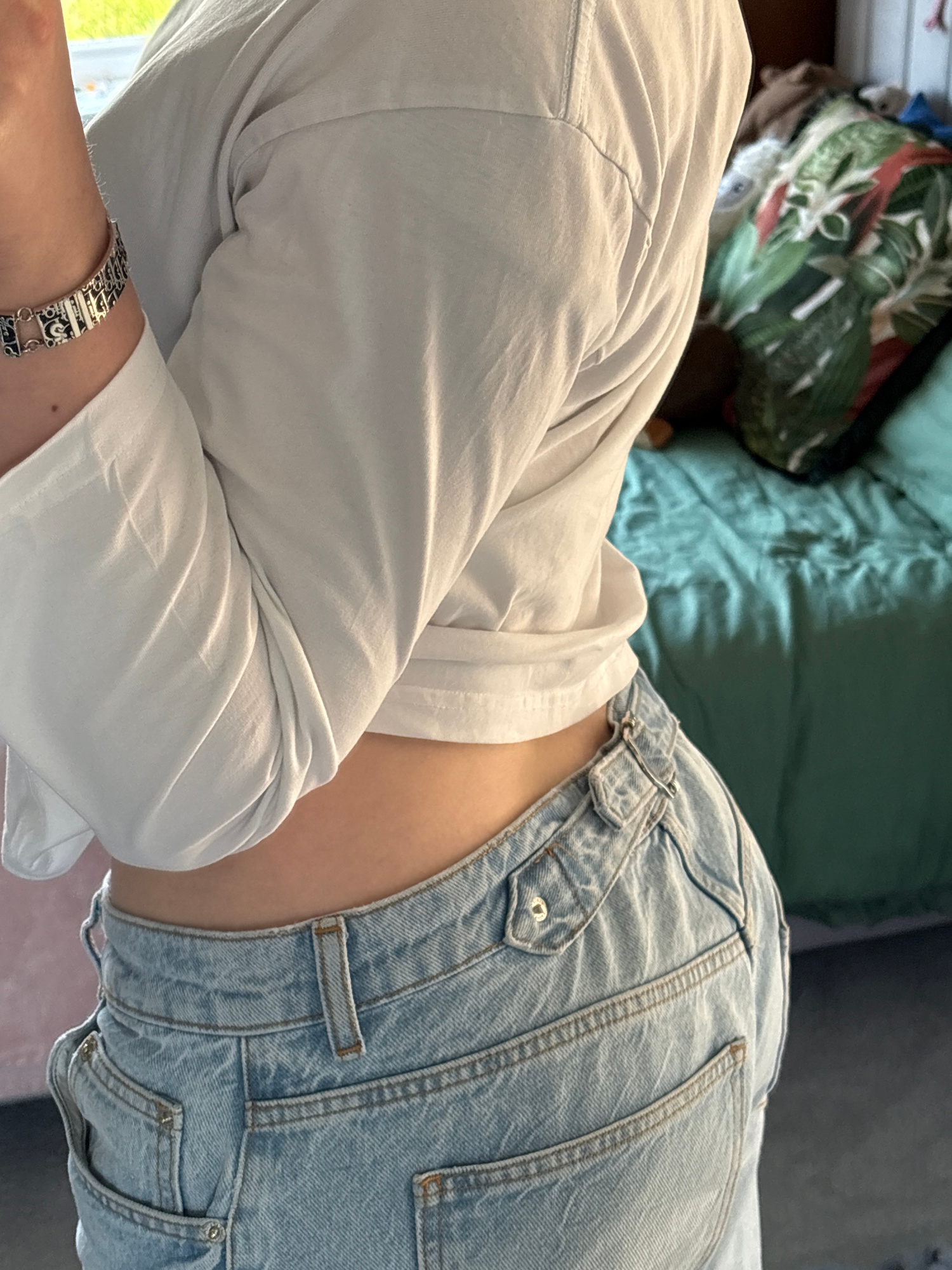 A person is wearing light blue denim shorts and a white shirt with a silver bracelet on their left wrist. They are lying on what appears to be a bed or sofa with a green and brown patterned cushion ne…read more