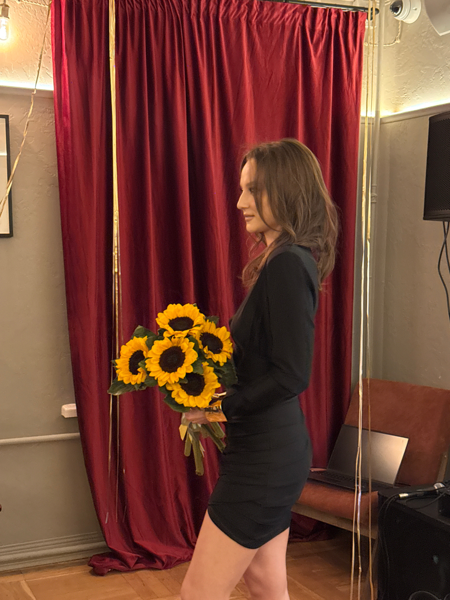 A woman in a black dress holds a bouquet of sunflowers in front of a maroon curtain. The curtain is partially obstructed by gold garland. A security camera is visible on the ceiling. The environment a…read more