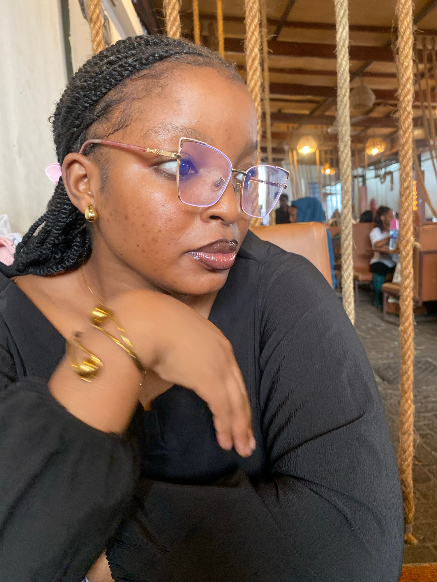 A person with brown skin is wearing eyeglasses and a black shirt. They have braided hair, a gold necklace, and gold earrings. The background features brown rope, wood paneling, and out-of-focus people…read more