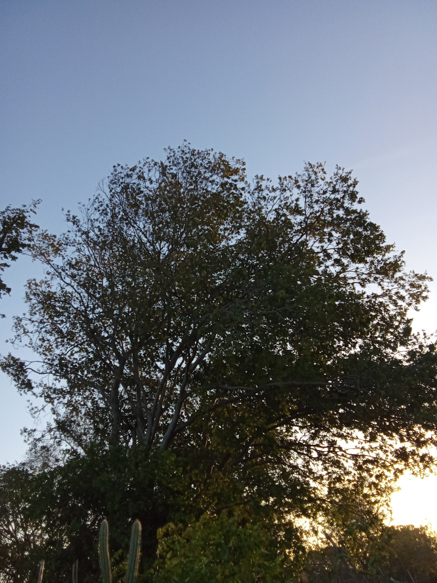 The image depicts a large tree in the city of Juan Griego, Venezuela, likely taken during either sunrise or sunset. The tree dominates the frame, its branches reaching towards the light blue sky. Sunl…read more