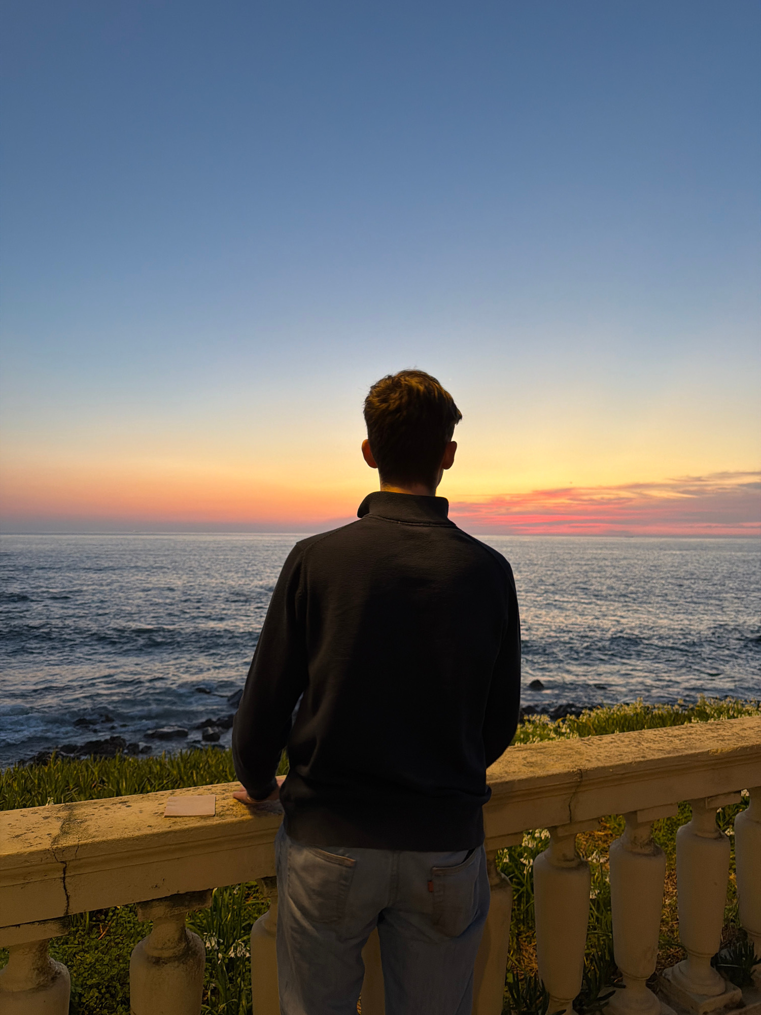 A male individual is observed from behind, standing on a coastal overlook in the city of Porto, Portugal, at sunset. He is positioned centrally, facing away from the camera and towards the Atlantic Oc…read more