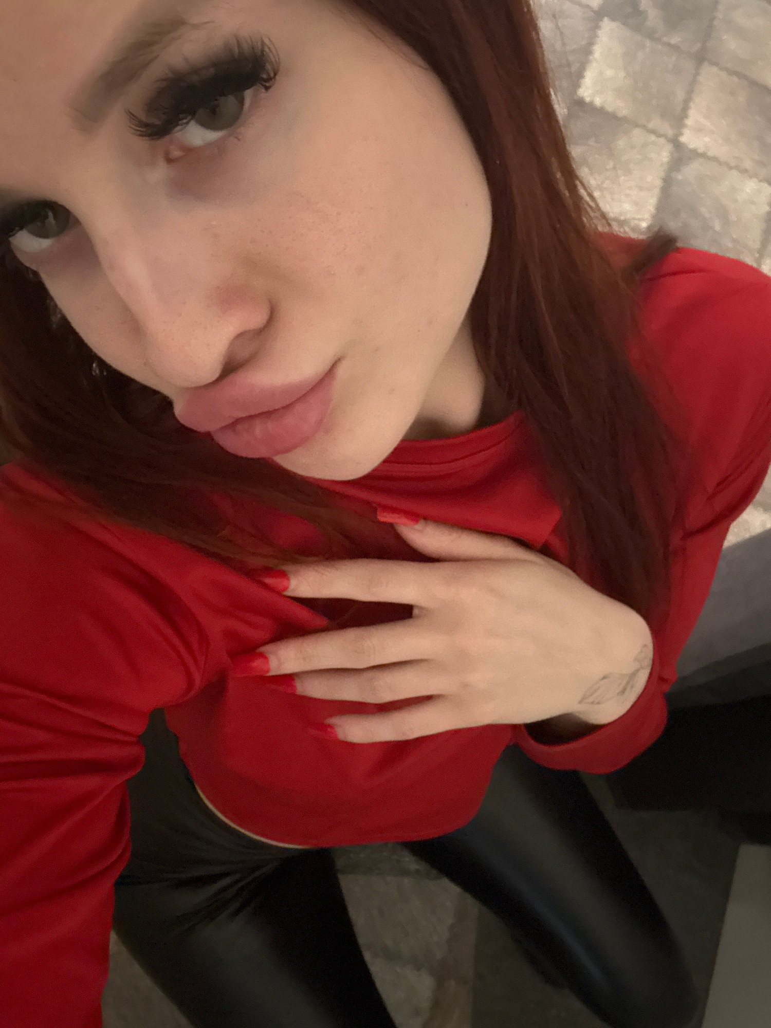 A selfie shot from a low angle features a woman with long red hair, wearing a red long-sleeved shirt and black leggings. Her left hand rests on her chest, with red nail polish visible. Her face is clo…read more