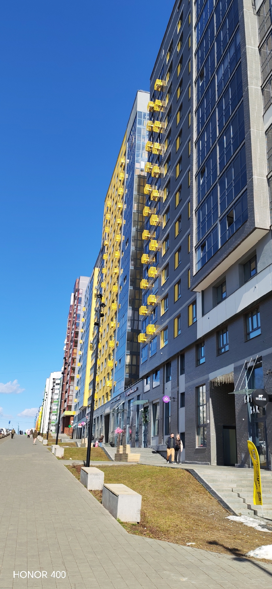 The image shows a street scene in Izhevsk, Russia, featuring a row of modern apartment buildings with colorful facades. The buildings vary in height and architectural style. One building has yellow ba…read more