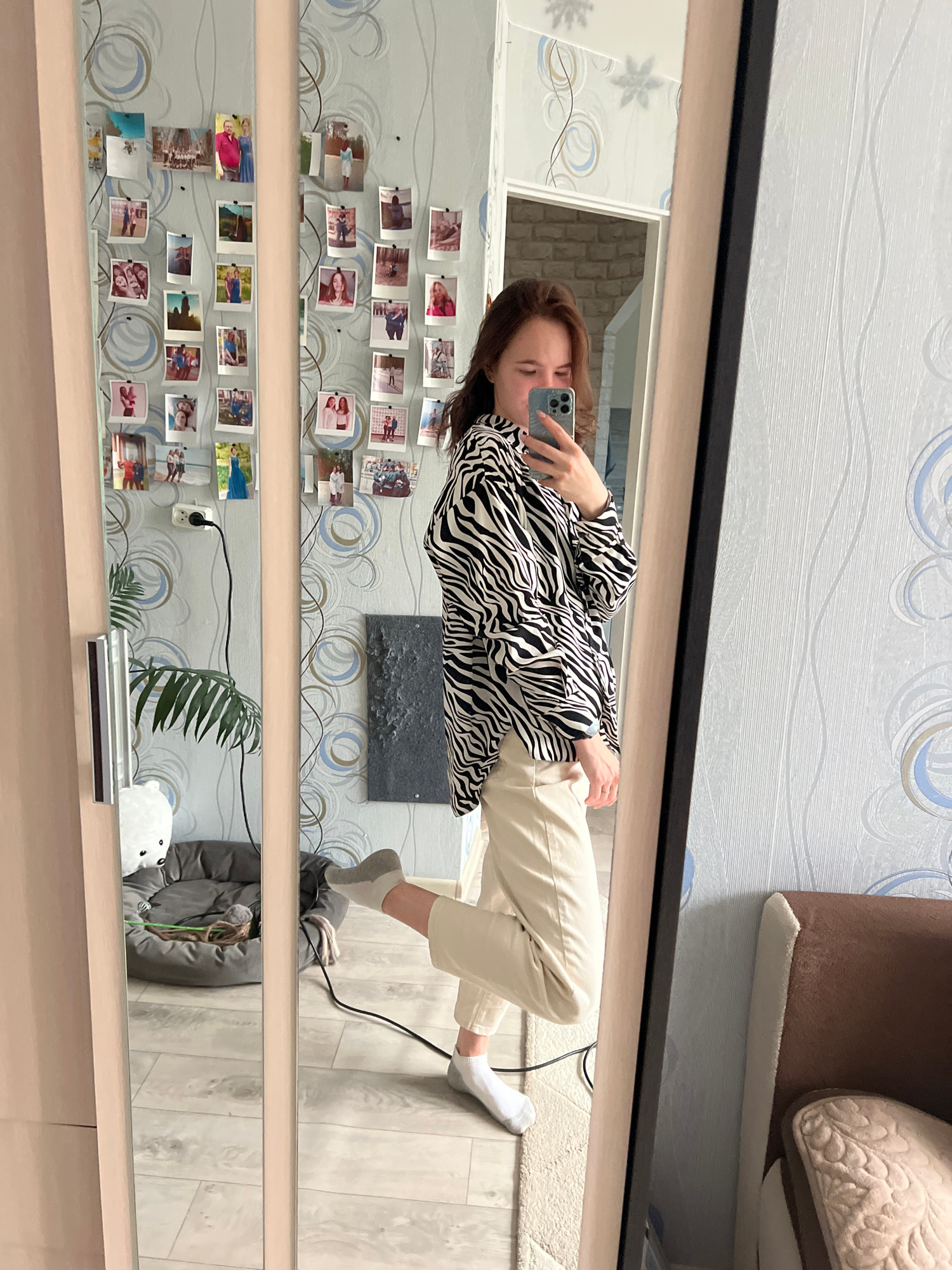 A full-body mirror selfie captures a young woman standing indoors, reflected in a large, light-framed mirror. The woman has brown hair and is engrossed in her smartphone, which she holds up to take th…read more