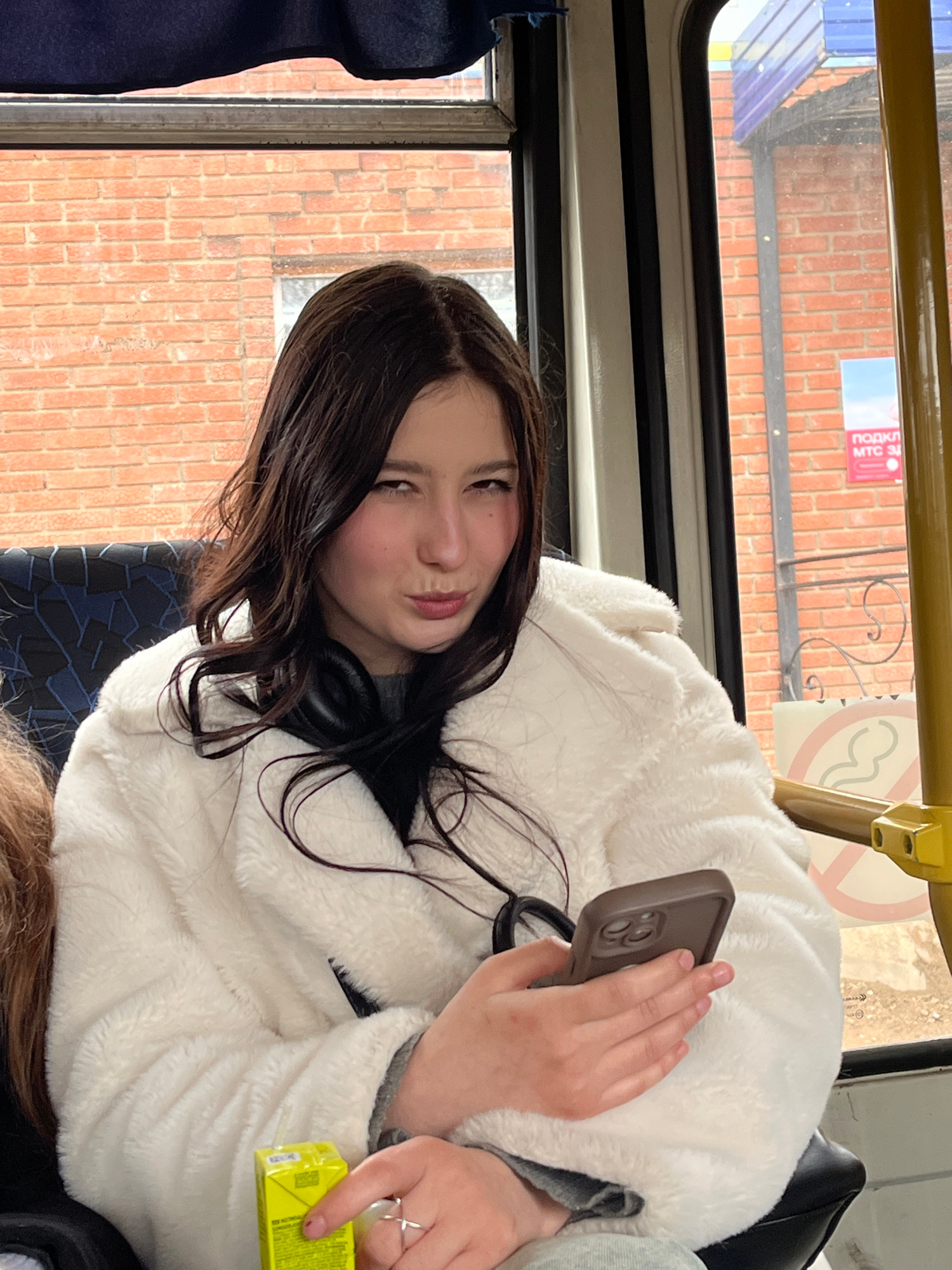 A young woman with long, dark hair is inside a bus. She is wearing a fluffy white jacket and headphones around her neck. She is holding a smartphone in her right hand and a small yellow juice box in h…read more