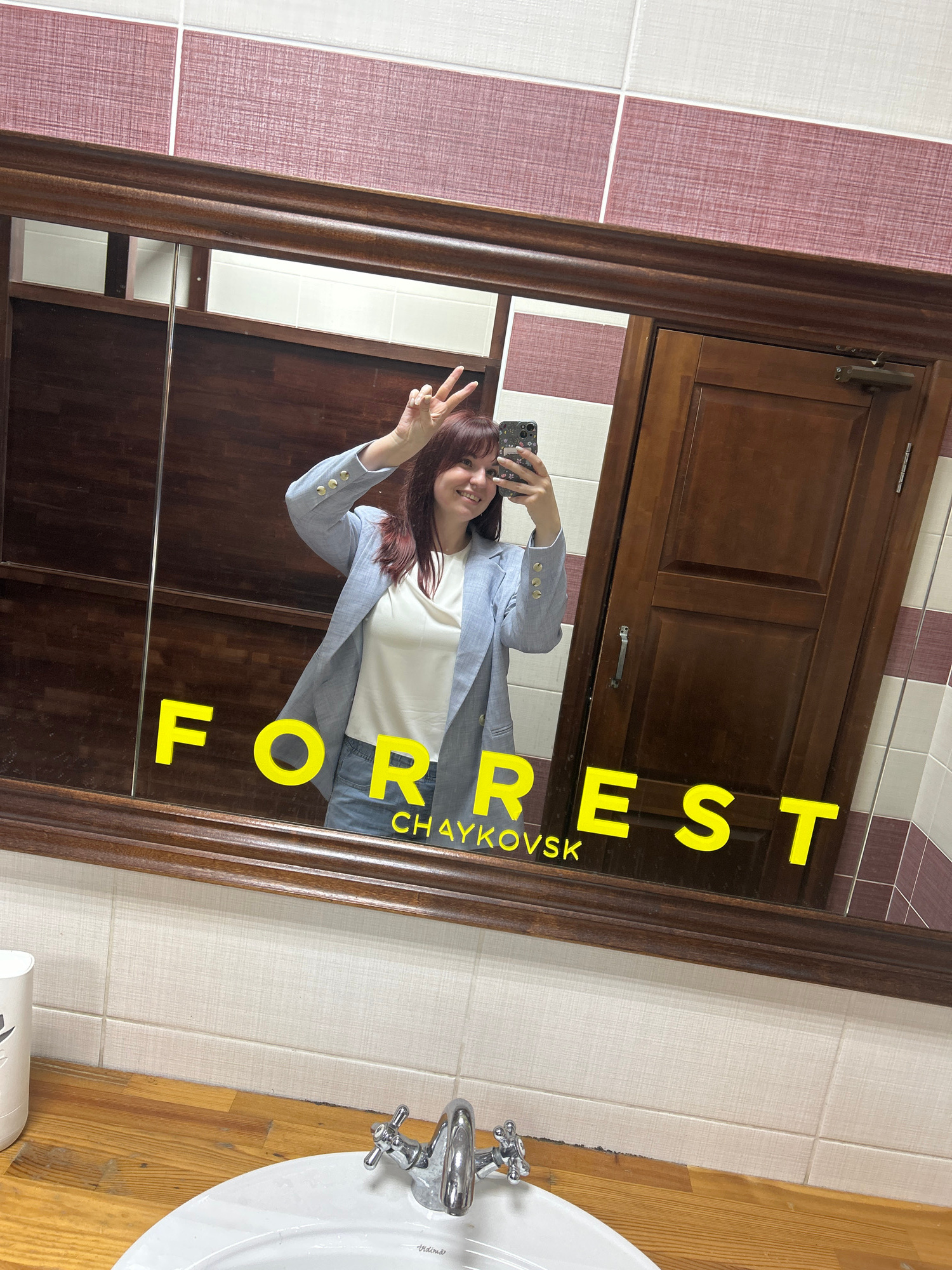 A woman is reflected in a mirror, taking a selfie in what appears to be a bathroom. The mirror has a dark wooden frame and a cabinet behind the reflection. The woman is wearing a light blue blazer oveโ€ฆread more
