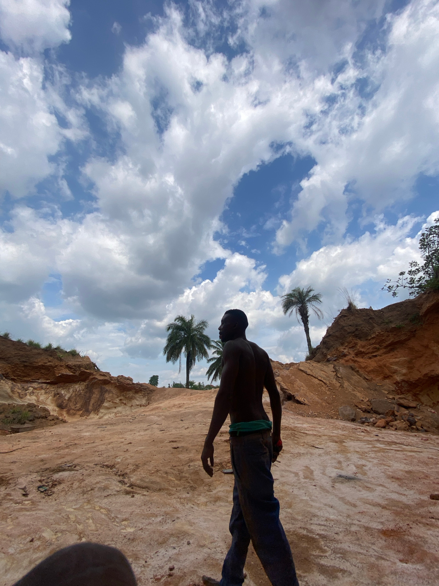 The scene depicts a shirtless Black man in jeans standing on a rocky, sandy terrain against a partly cloudy sky with palm trees. It appears to be outdoors, possibly in Igbara, Nigeria, given the conte…read more