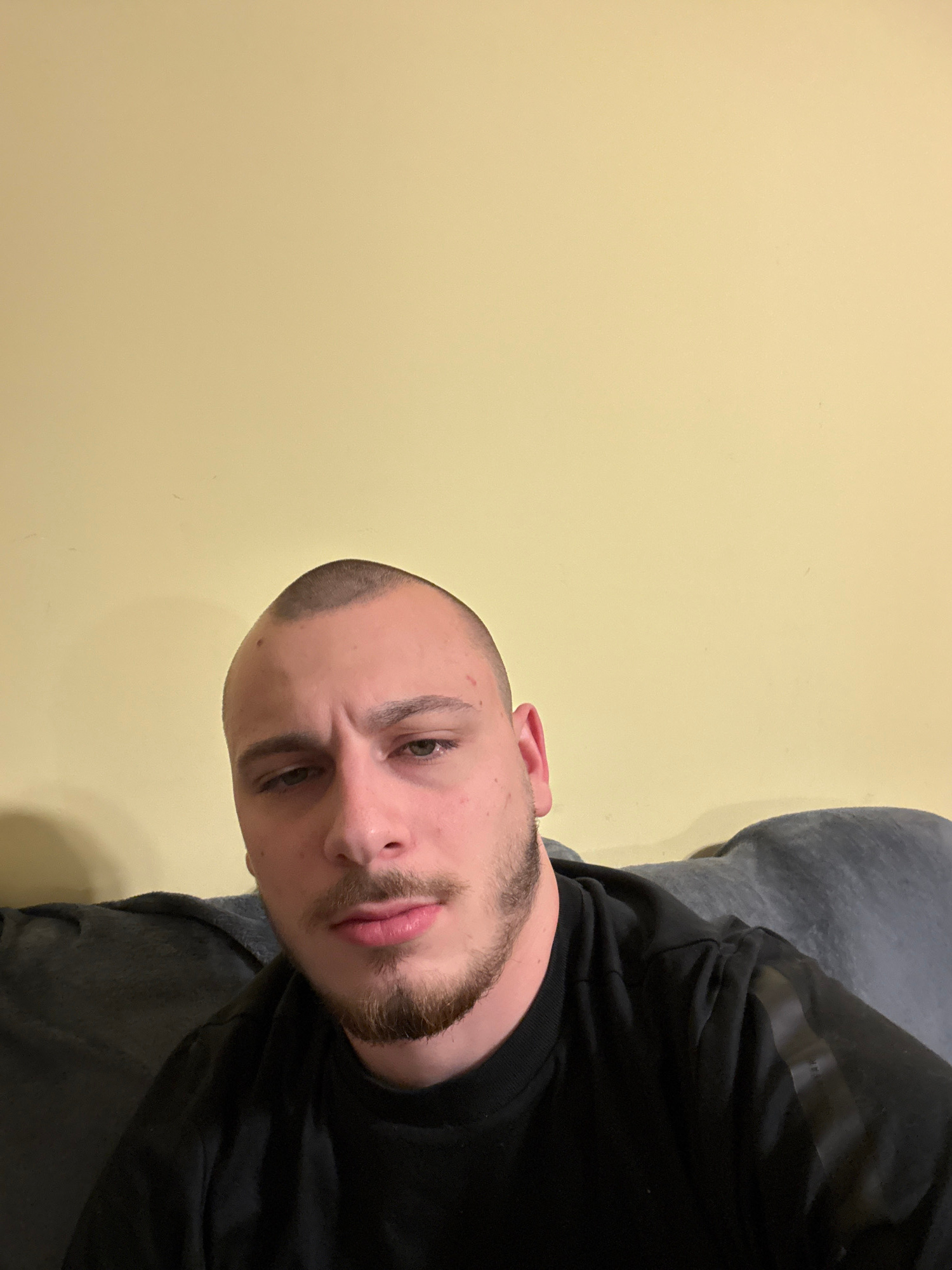 A medium-close shot of a man’s face, taken from a slightly downward angle. The man has a closely shaved head and a short beard. He is fair-skinned. The background is a plain, light yellow wall and a g…read more