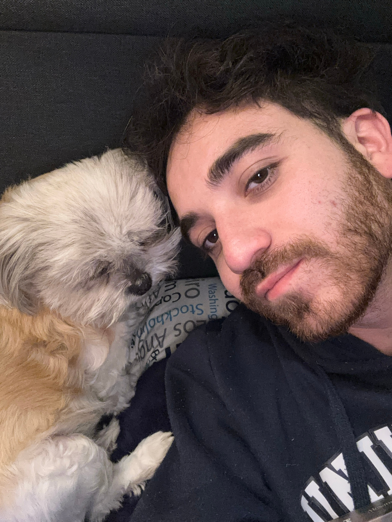 A man is lying down, with his head turned slightly to the left and resting near a small dog. The man has brown hair and a beard. The dog appears to be a Shih Tzu mix, with light brown and gray fur. Th…read more