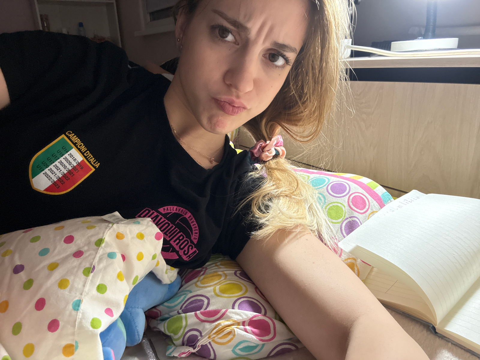 A woman is lying down, looking at the camera with a slightly quizzical expression. She has fair skin, brown eyes, and blonde/brown hair pulled back with a scrunchie. She is wearing a black t-shirt wit…read more