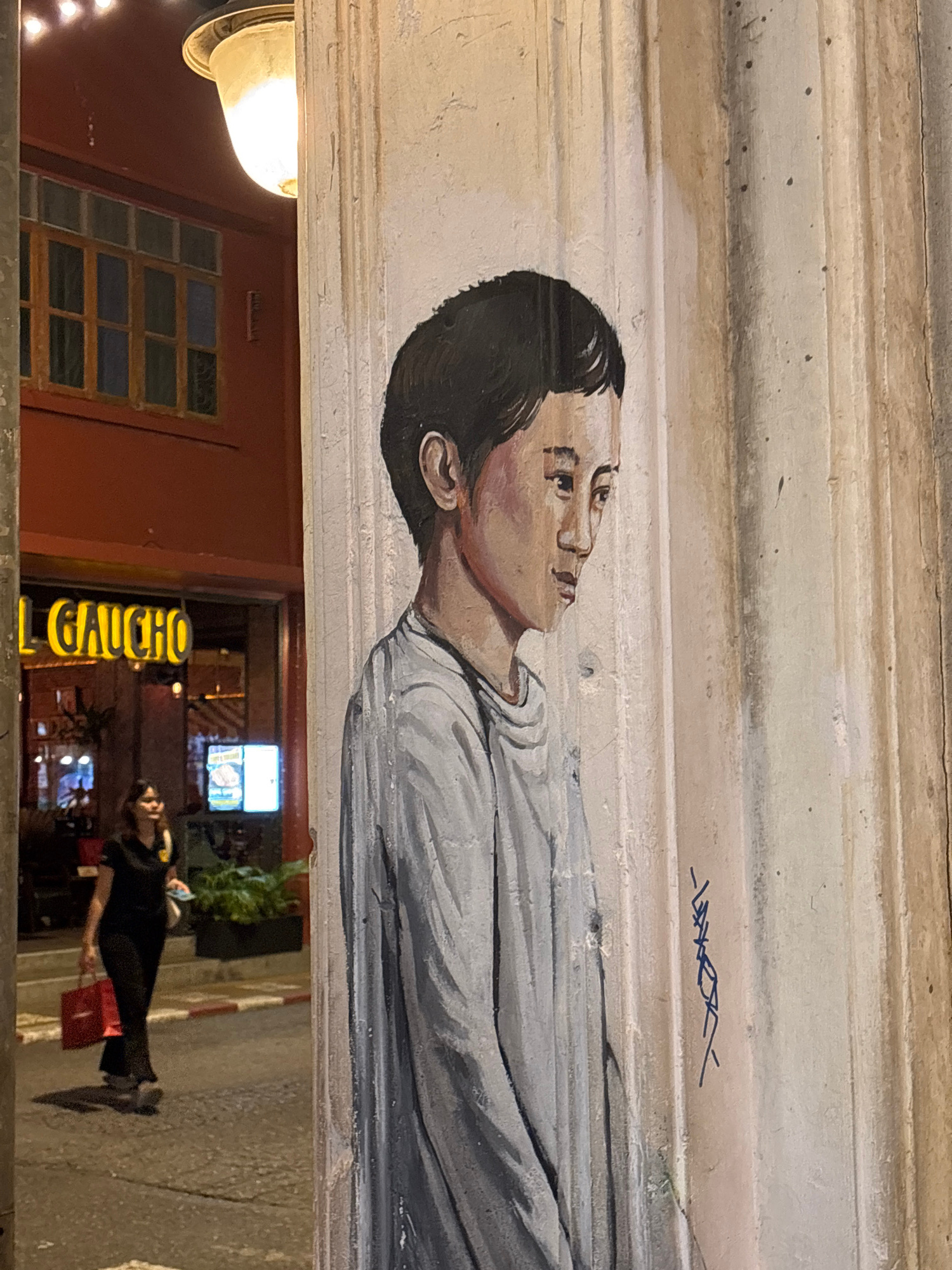 The image is of a mural of a person's face painted on a wall in Phuket City Municipality, Thailand. The person in the mural is lying down with their head turned to the right. The mural is on a light-c…read more