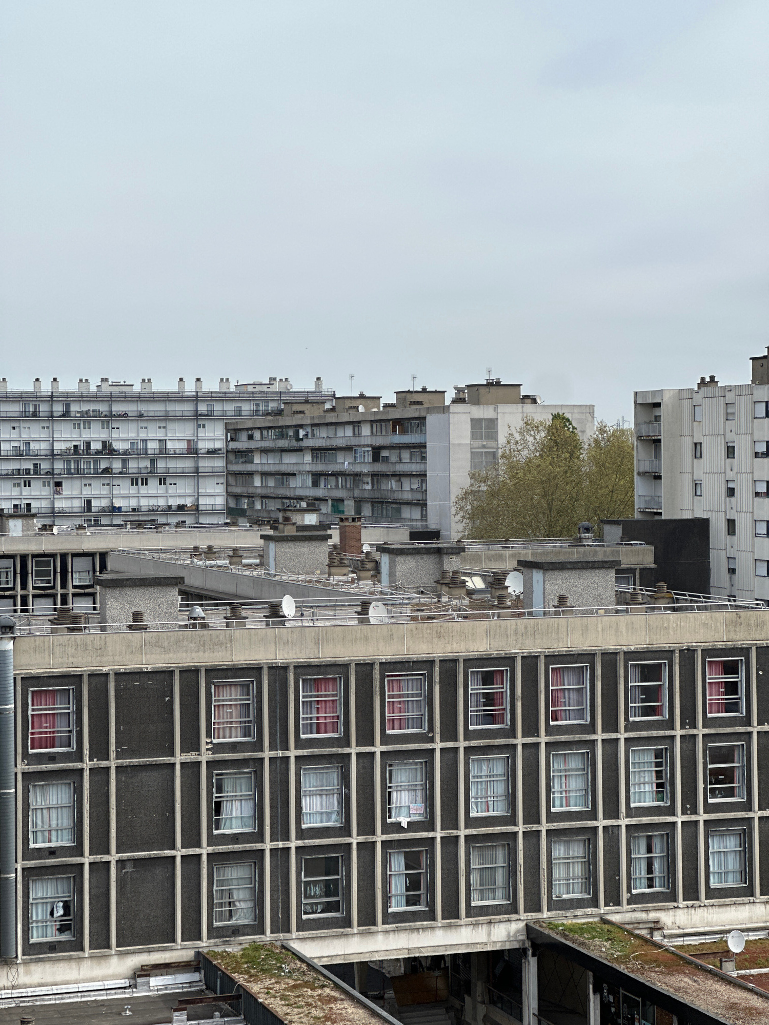A medium shot presents a view of a group of high-rise apartment buildings on a cloudy day. The buildings are primarily gray, with some windows open and others closed. Satellite dishes are visible on t…read more