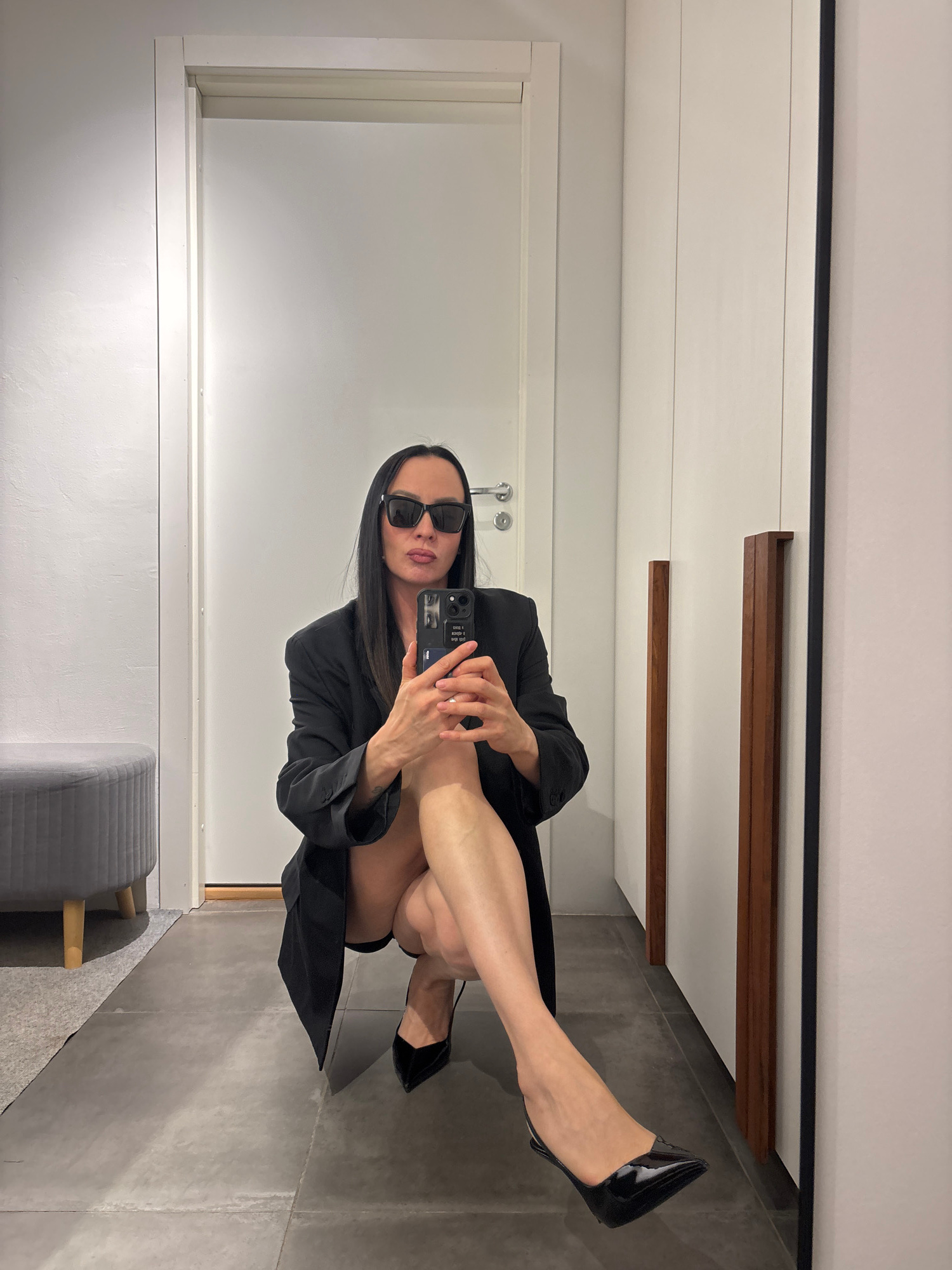 A woman wearing sunglasses and a black blazer is crouching and taking a selfie. She is also wearing black high heels. She is in a room that appears to be a dressing room or bathroom, with white walls…read more