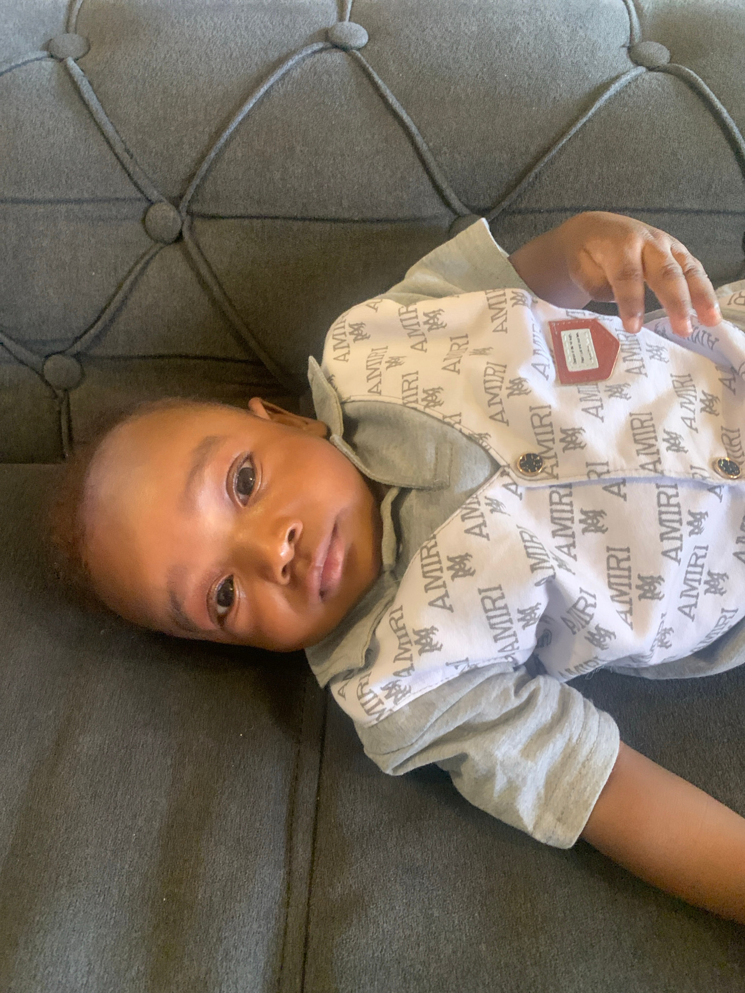 A baby is lying on a gray tufted couch. The baby is wearing a light gray and white outfit with the word "AMIRI" printed repeatedly, alongside a logo. The baby's head is oriented towards the bottom of…read more