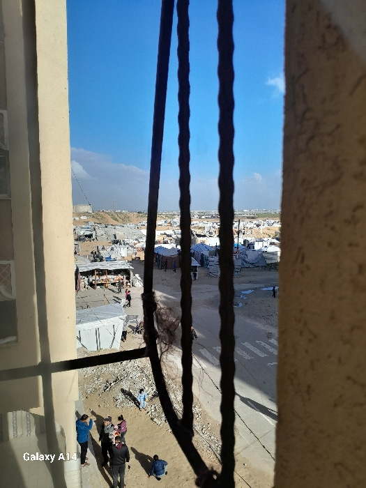 The image depicts a view from a high vantage point, possibly a balcony. A railing partially obscures the scene below, which appears to be a densely populated area with makeshift shelters or buildings.…read more
