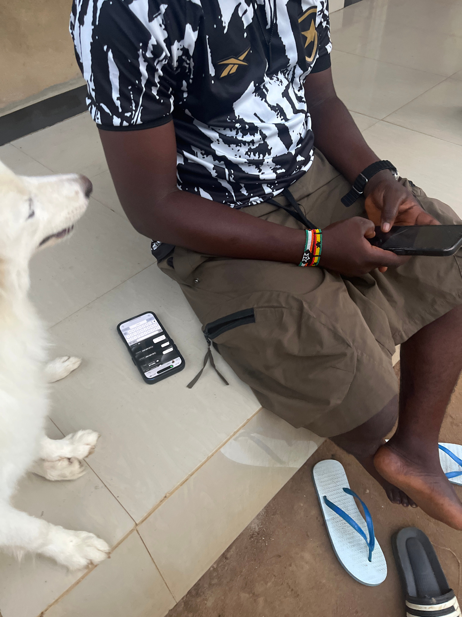 A man sits on a tiled floor, holding and looking at a smartphone in his hands. A second smartphone lies on the floor near him. He is wearing brown shorts, a black and white shirt, a watch, and a beade…read more