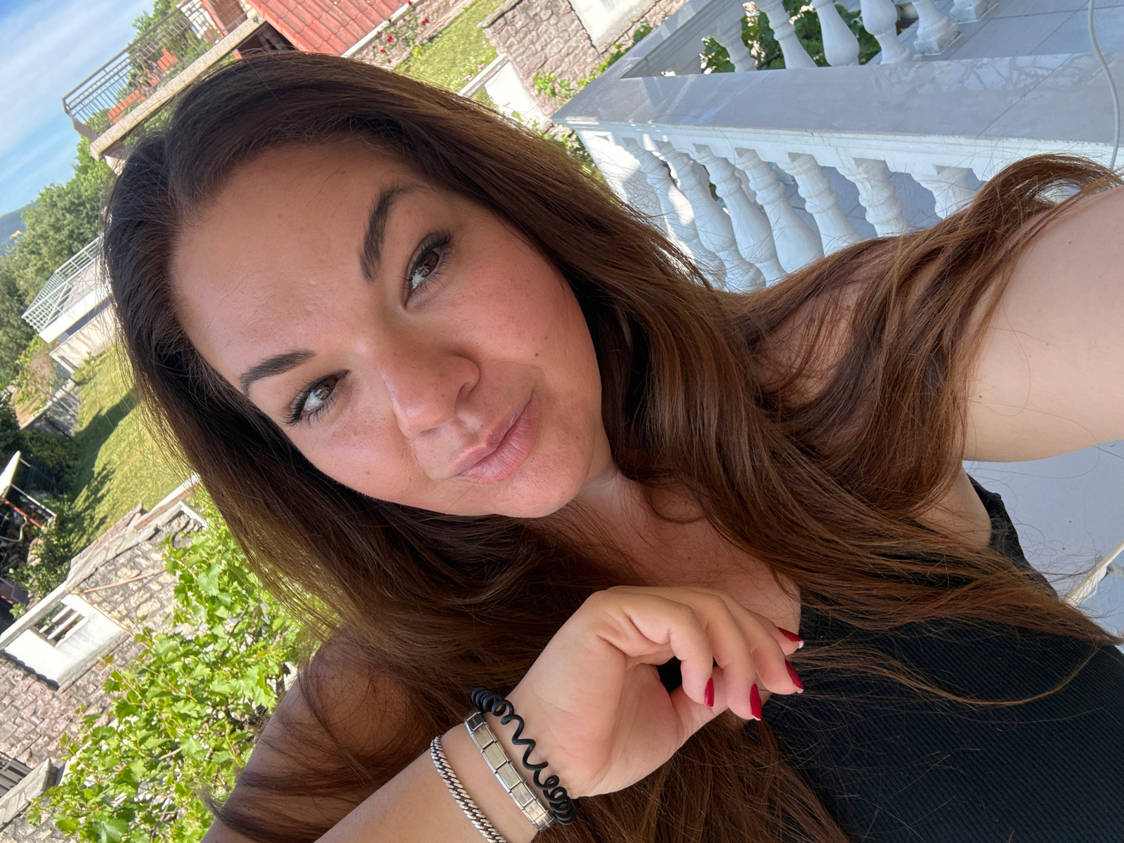 A woman with long brown hair and red nail polish is taking a selfie outdoors. She is wearing two bracelets, one silver and one black. In the background, there is a white balustrade, trees, buildings,…read more