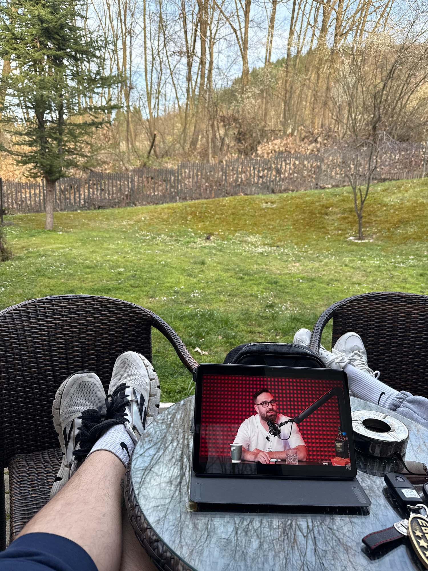A man is seated on a wicker chair, with a tablet on a glass table displaying a video of a man with a beard and glasses recording a podcast. The seated man is wearing grey and white sneakers with black…read more