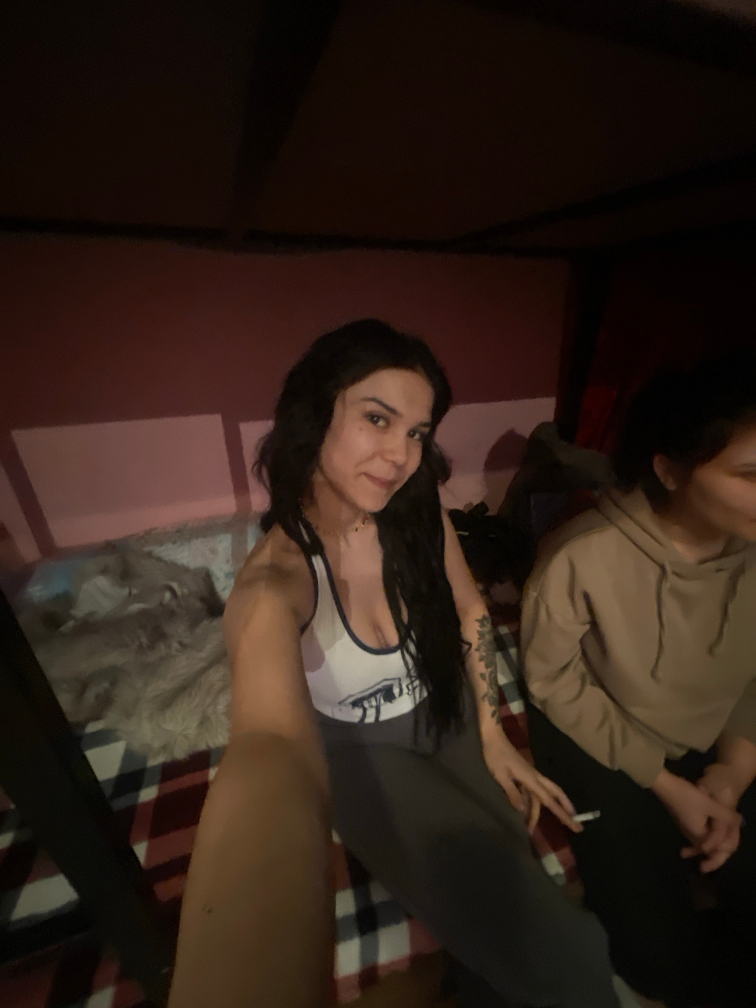 The image depicts a scene indoors, with two people and an animal present. One person is lying down, facing the camera. They have dark hair and are wearing a light-colored tank top with dark trim and g…read more