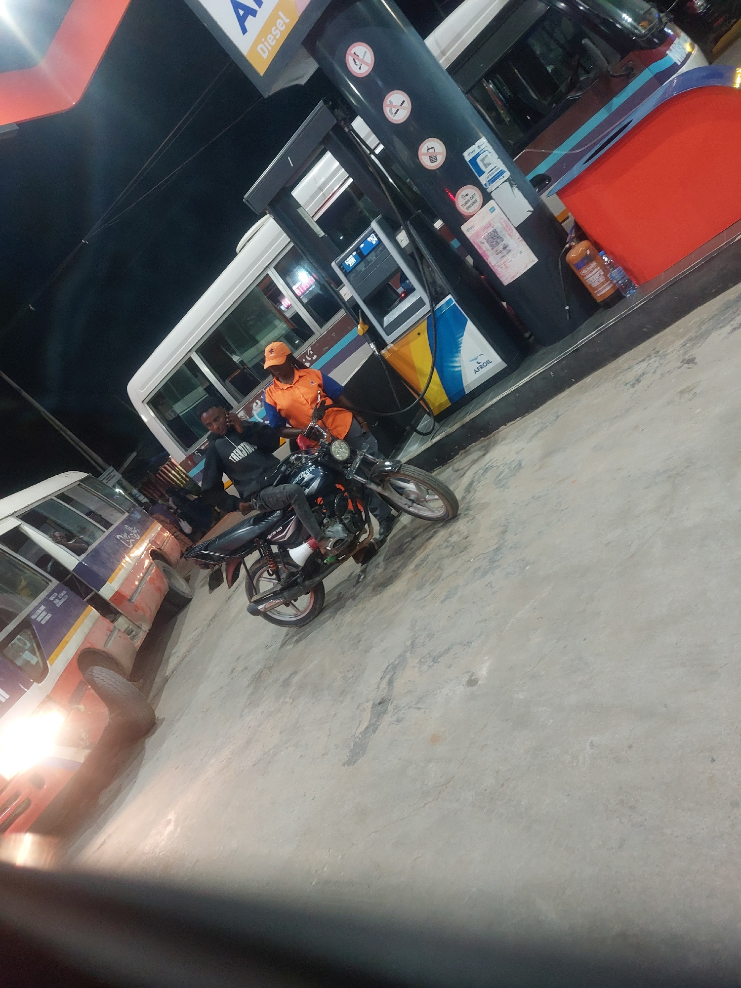 The image shows a gas station at night, possibly in Dar es-Salaam, Tanzania, based on the "Afroil Diesel" sign. A man in an orange shirt and cap is near a gas pump. Another man, wearing a black hooded…read more