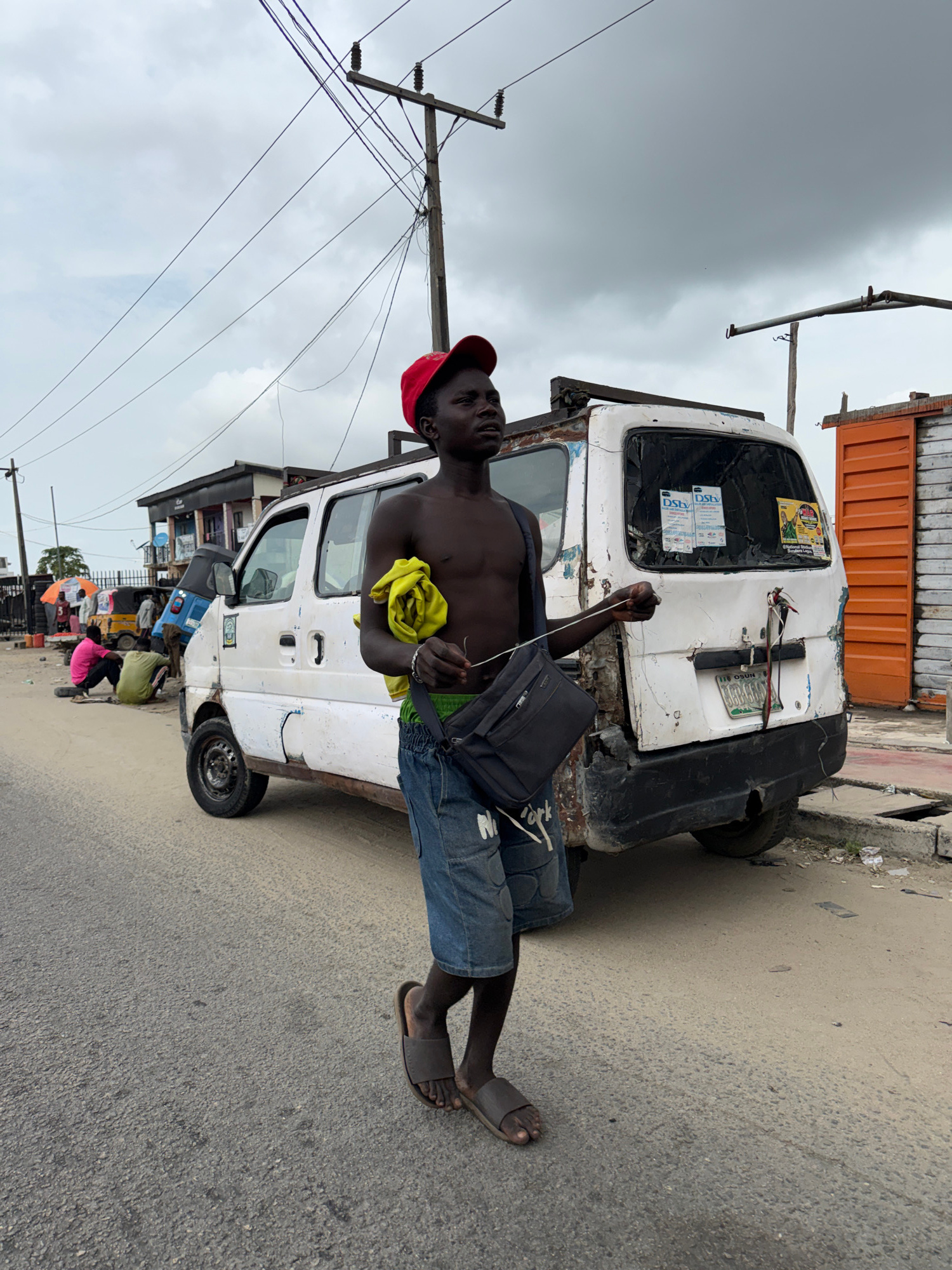 A shirtless man in a red cap and blue denim shorts stands in front of a dilapidated white van, holding a yellow cloth. He has a black shoulder bag and wears sandals. The van is parked on a paved stree…read more