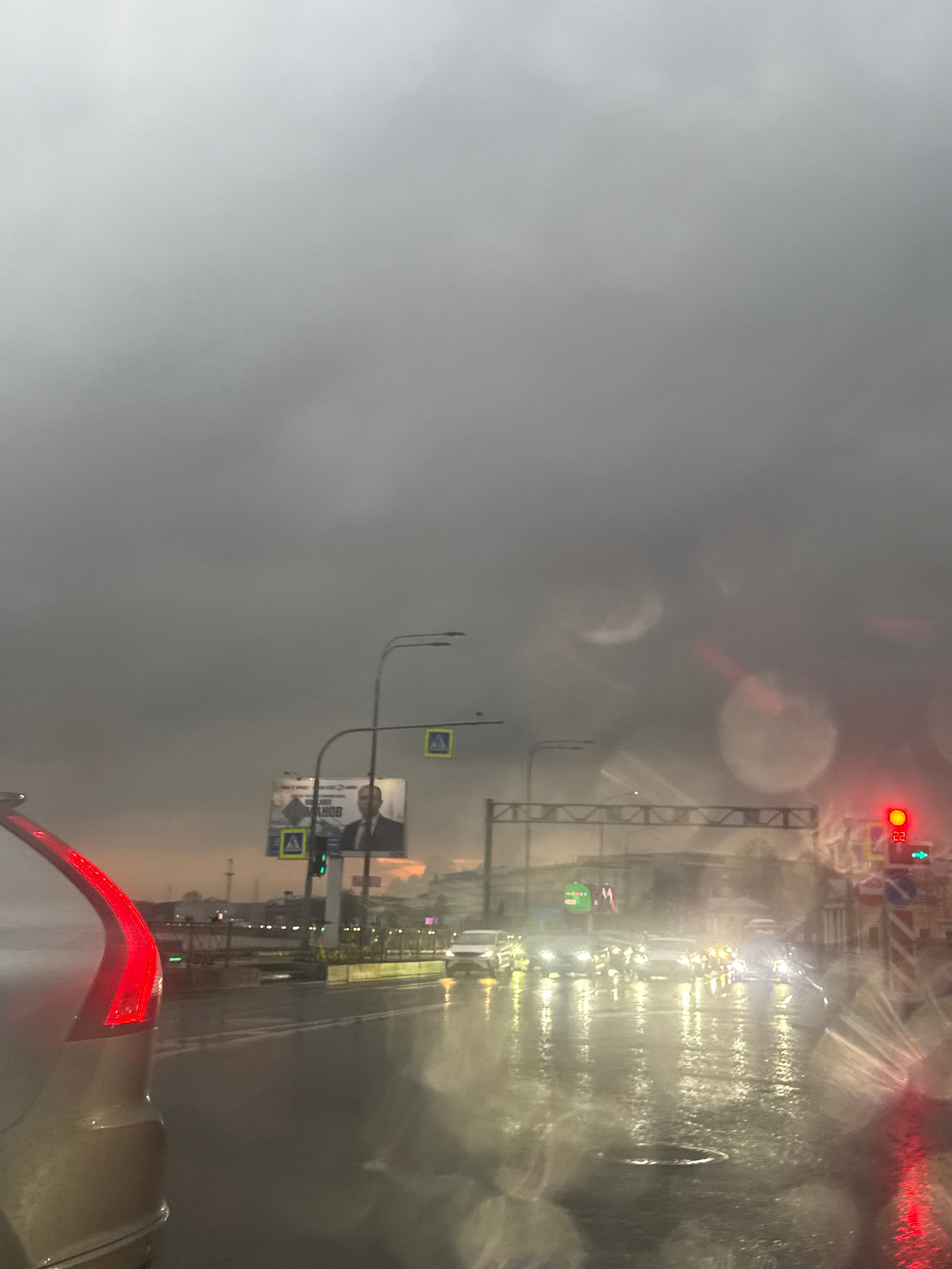 The image shows a view from inside a car driving in Saint Petersburg, Russia during heavy rain. The road is wet and reflects the lights of other vehicles. Traffic signals are visible, with one display…read more