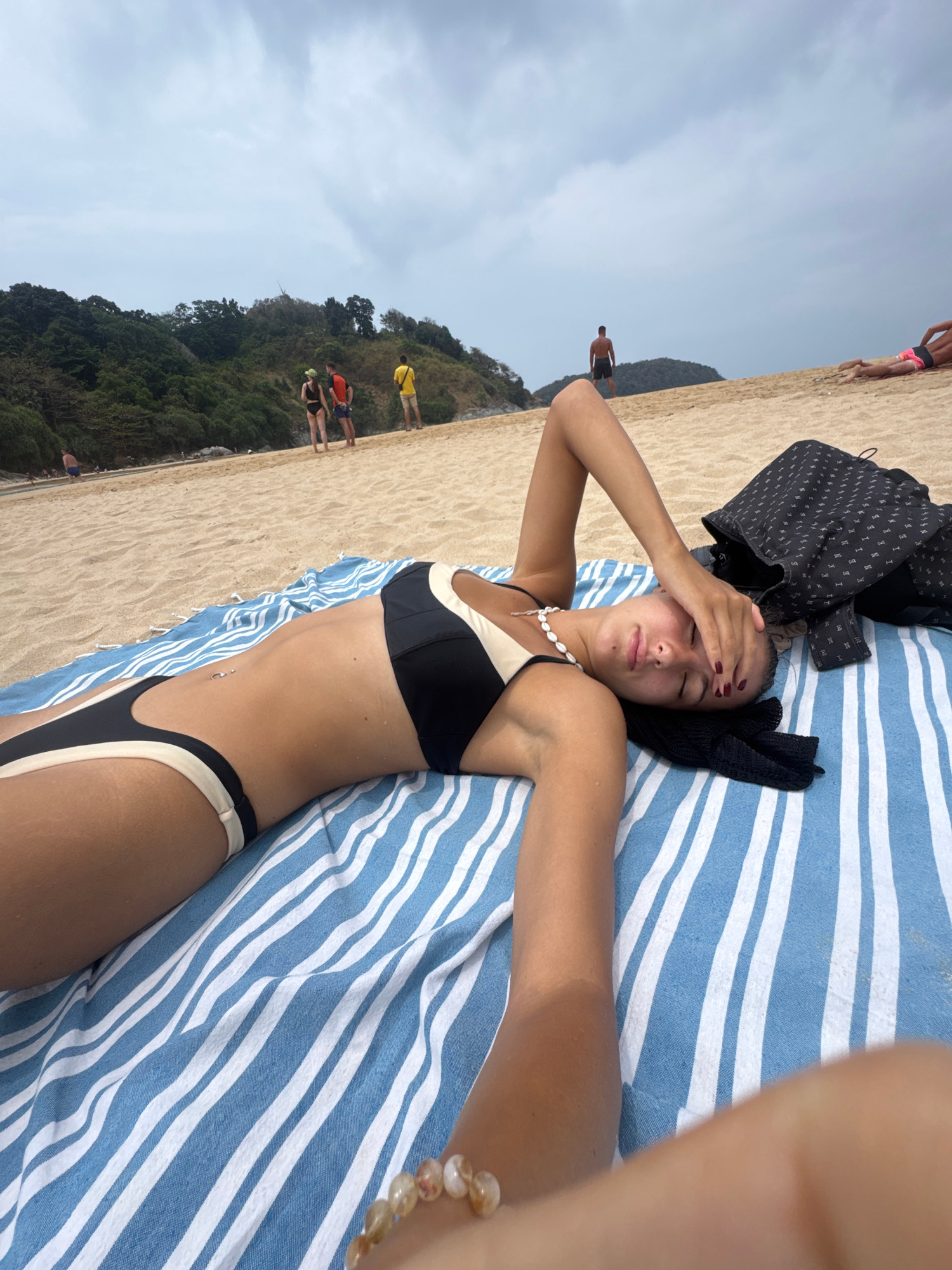 A young woman is lying on a blue and white striped towel on the sand. She is wearing a black and tan bikini and has a shell necklace. She is holding her hand to her forehead and appears to have her ey…read more
