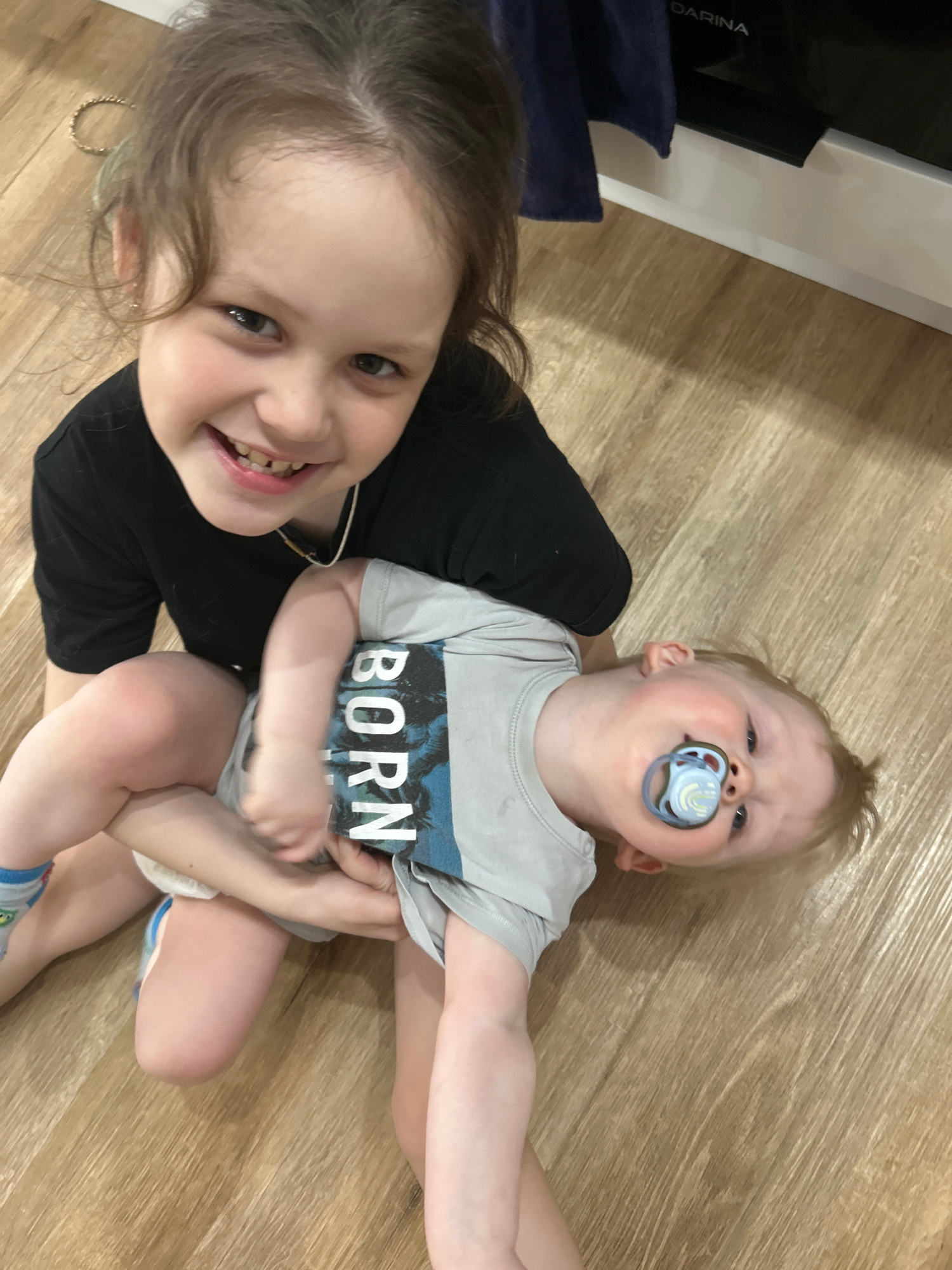 A young girl with brown hair smiles at the camera while holding a baby. The baby has blond hair and a pacifier in its mouth. The baby is wearing a gray shirt with the word "BORN" printed on it. They a…read more