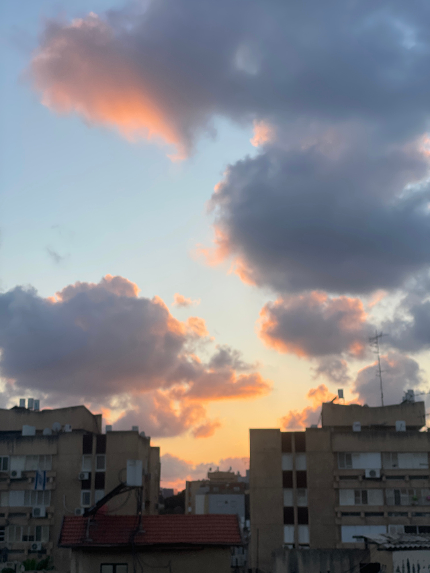 The image depicts a sky with a mix of gray and orange-tinted clouds, suggesting either sunrise or sunset. Tall, multi-story buildings are visible on the right side of the frame, with multiple windows…read more
