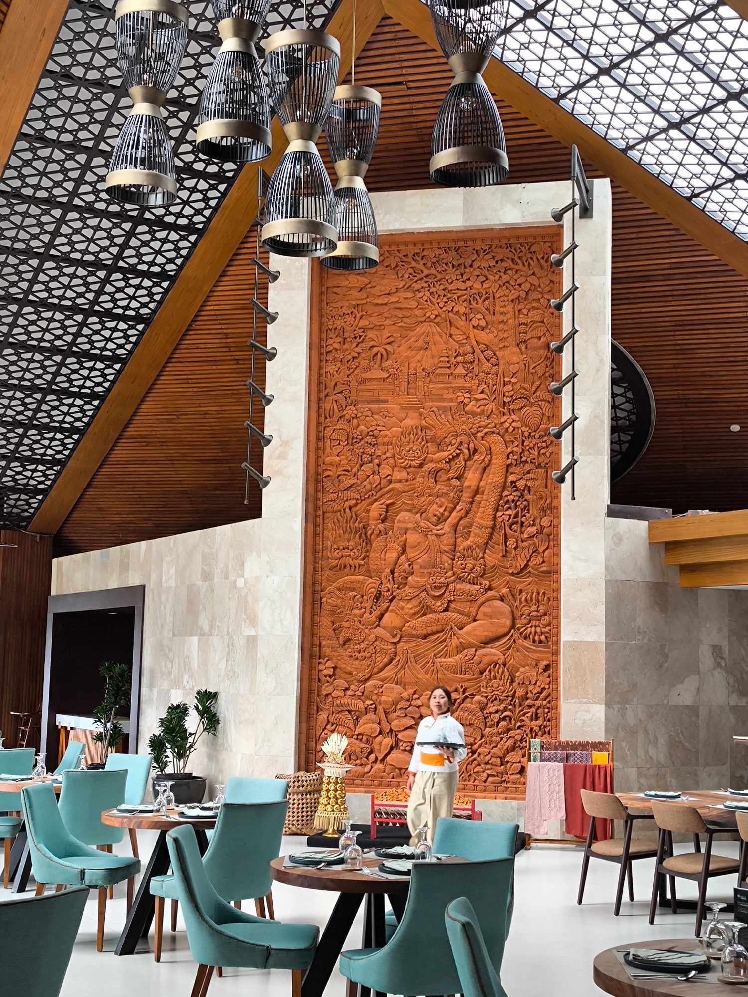 The image depicts the interior of a dining establishment in Wanagiri, Indonesia. Dominating the scene is a large, intricate terracotta-colored relief carving on a wall. In front of this carving standsβ¦read more