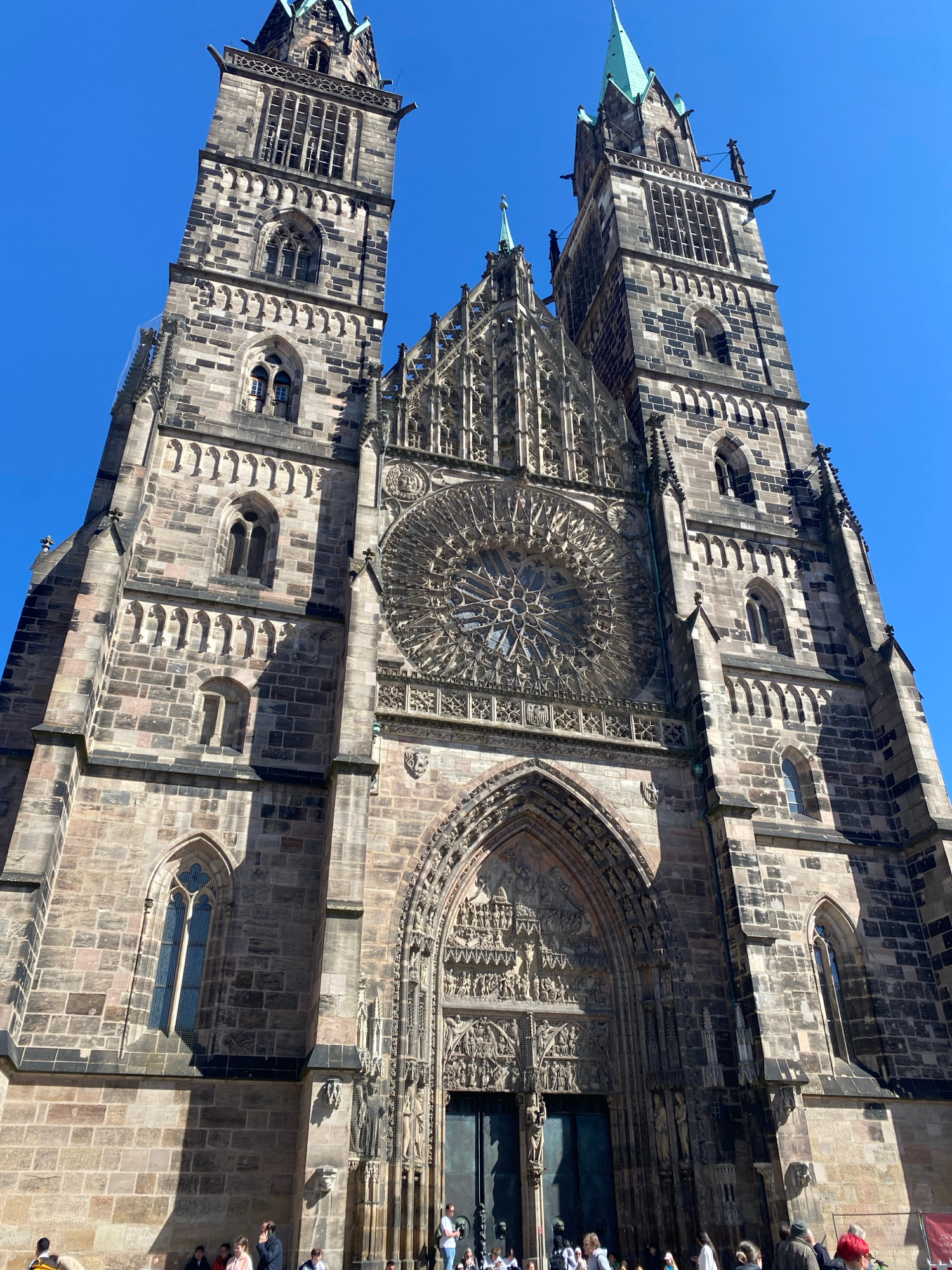 The image shows the Saint Lorenz Church, a major church in Nuremberg, Germany, viewed from below at a tilted perspective. The church features a Gothic style architecture with two prominent towers, a l…read more
