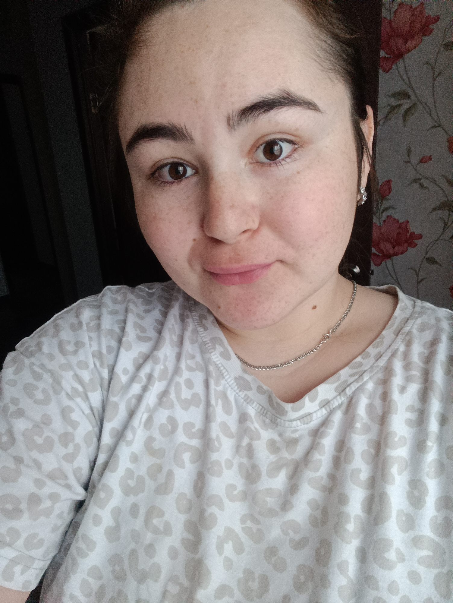 A young woman with fair skin and freckles is centered in the frame, looking directly at the camera. She has dark brown eyes and hair pulled back. She is wearing a light-colored t-shirt with a leopard print pattern and a silver chain necklace. Behind her, to the left, is a dark doorway or the edge of a wall. To the right, there is wallpaper with a floral pattern, predominantly red flowers. The setting does not provide sufficient information to determine a specific location within the city of Noviy, Russia. | Open Wire