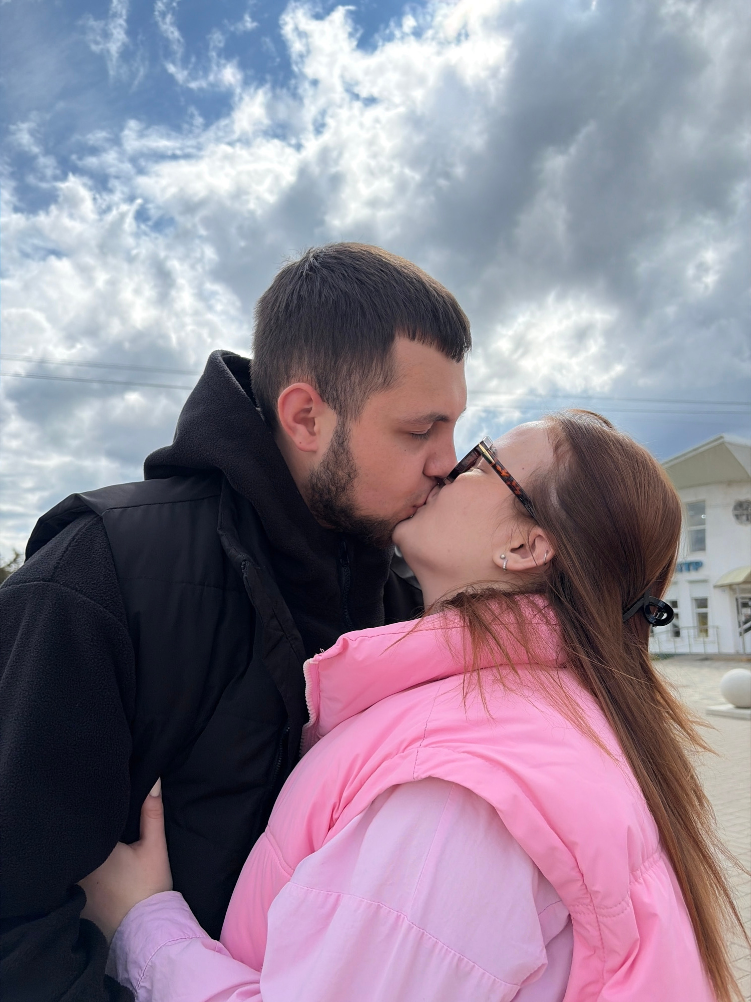 A man and a woman are kissing outdoors. The woman is wearing glasses and a pink jacket. The man is wearing a black jacket with a hood. The sky is overcast with clouds. The location appears to be Novop…read more