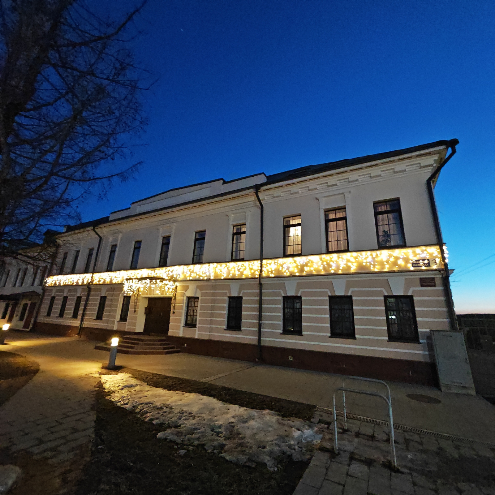 The image captures a two-story building at night, adorned with a string of warm-toned lights along its facade. The building is likely located in Novo-Nikol'skoe, Russia, based on the sign visible on t…read more