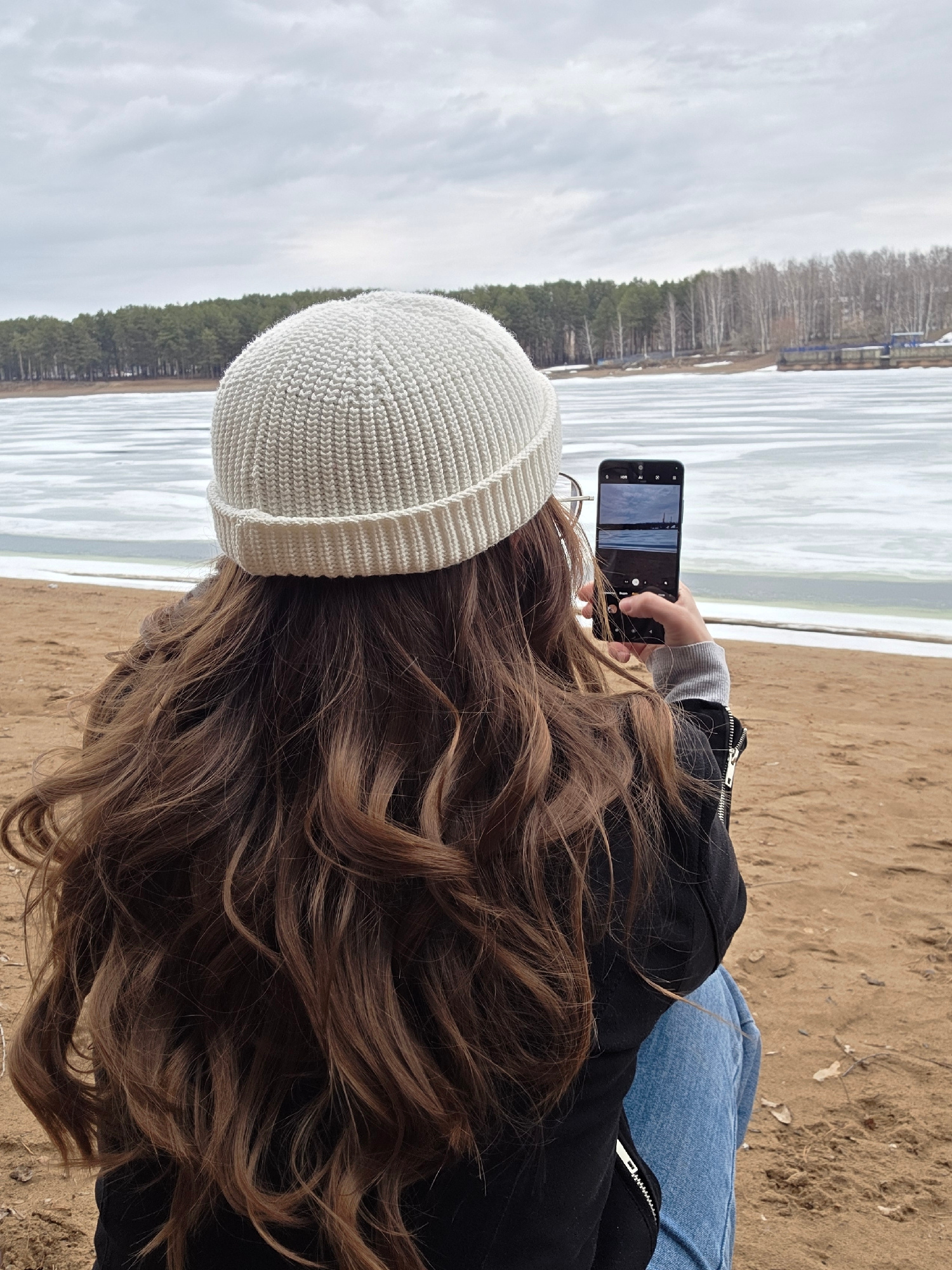 A person is standing on a beach on the shore of a body of water, possibly the Kama River, in Chaikovsky, Russia. The person has long, brown hair and is wearing a white knit cap, a black jacket, and bl…read more