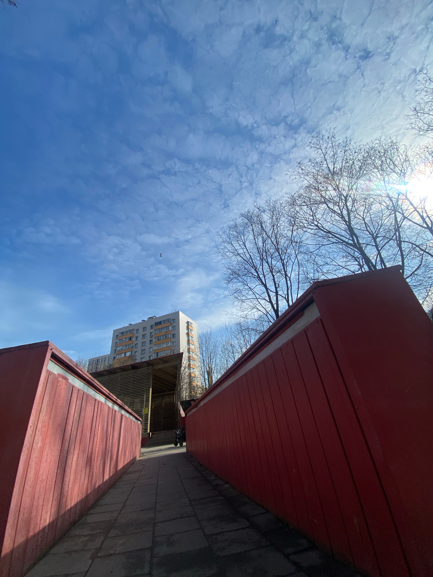 The image shows a view looking up at a partially cloudy blue sky, framed by the edges of red buildings or structures on either side. Bare tree branches are visible against the sky. In the distance, a…read more