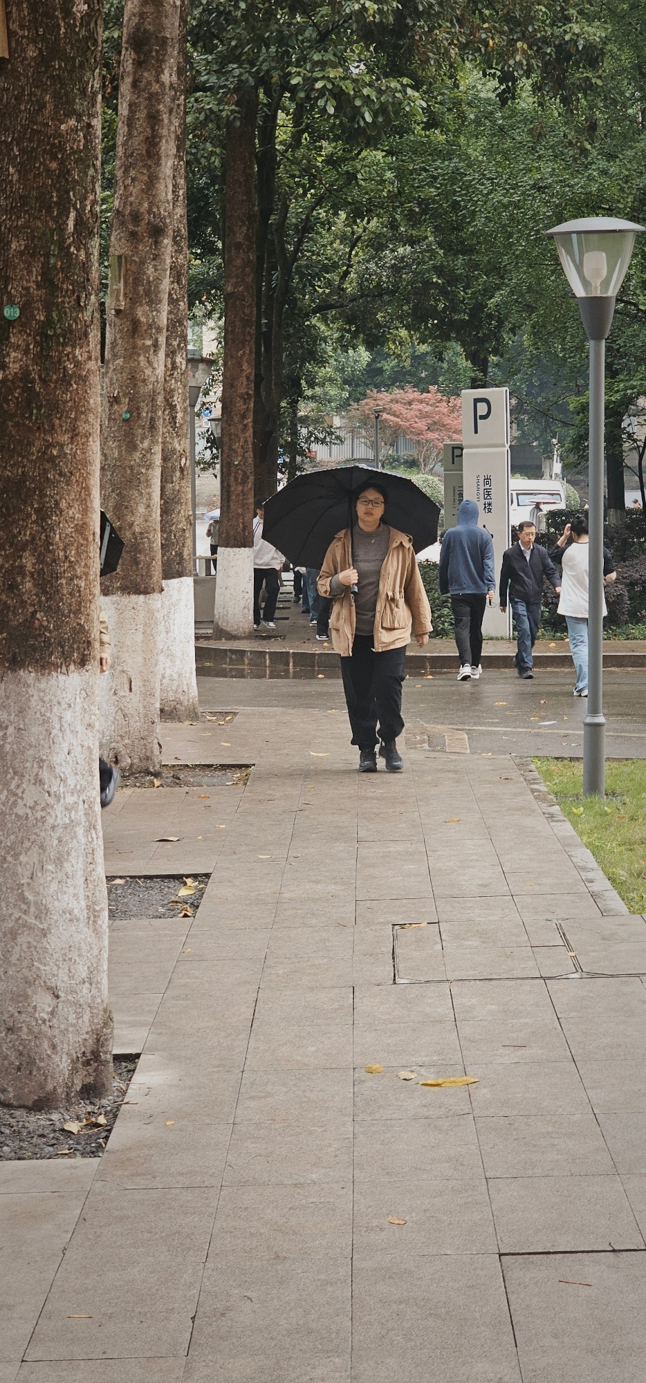 A woman with short dark hair and glasses holds a black umbrella while walking on a sidewalk next to a street in Yuzhong District, China. She wears a grey sweater and khaki jacket. Other people are vis…read more