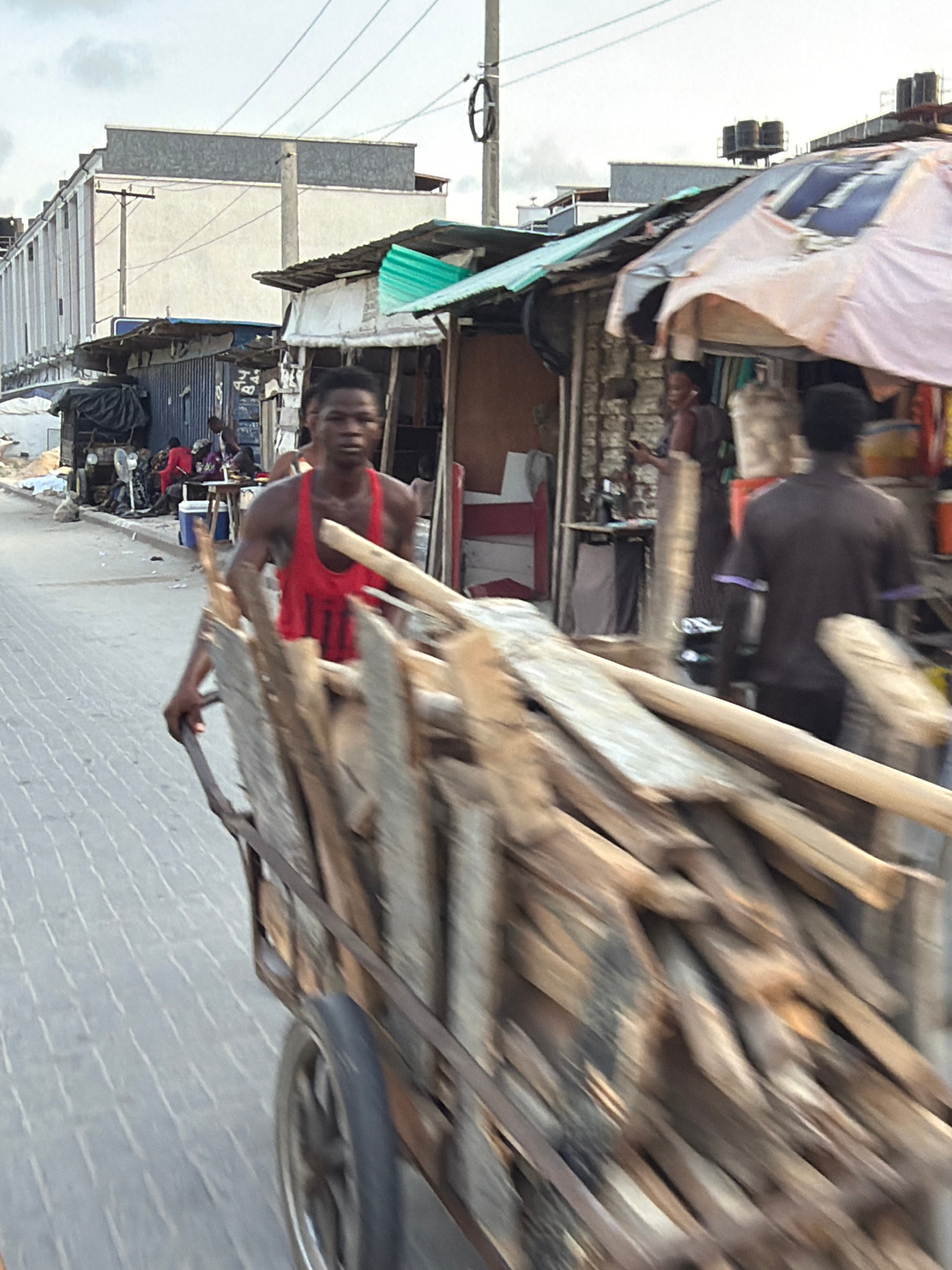 The image depicts a man in Igboefon, Nigeria, pulling a cart loaded with lumber along a paved street. The street is lined with small shops and dwellings, some with corrugated metal roofs. Other people…read more